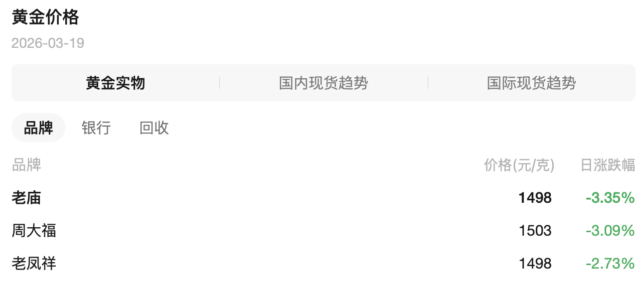 国内金饰价格应声跟跌:老庙黄金足金报价从昨日的1550元/克跌至今日的1498元/克,下跌52元;周生生更是从1547元/克跌至1492元/克,跌幅达55元。相较3月初的月内高点,多品牌金饰已累计下跌超130元。