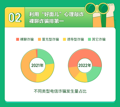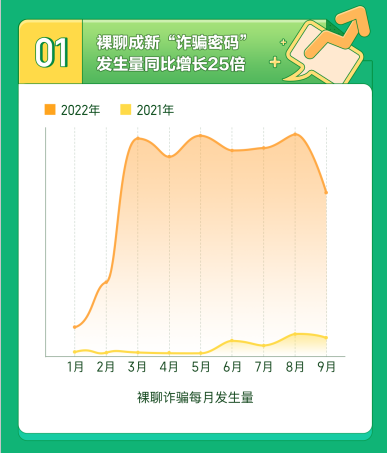 近日,360数科反诈实验室发布《2022年前三季度裸聊诈骗态势分析报告》(以下简称“报告”),数据显示:今年前三季度,裸聊诈骗发生量同比增长25倍,诈骗占比达53.69%,位居电信诈骗类型首位,九成以上受害者为40岁以下中青年男性,平均财损金额10685元。