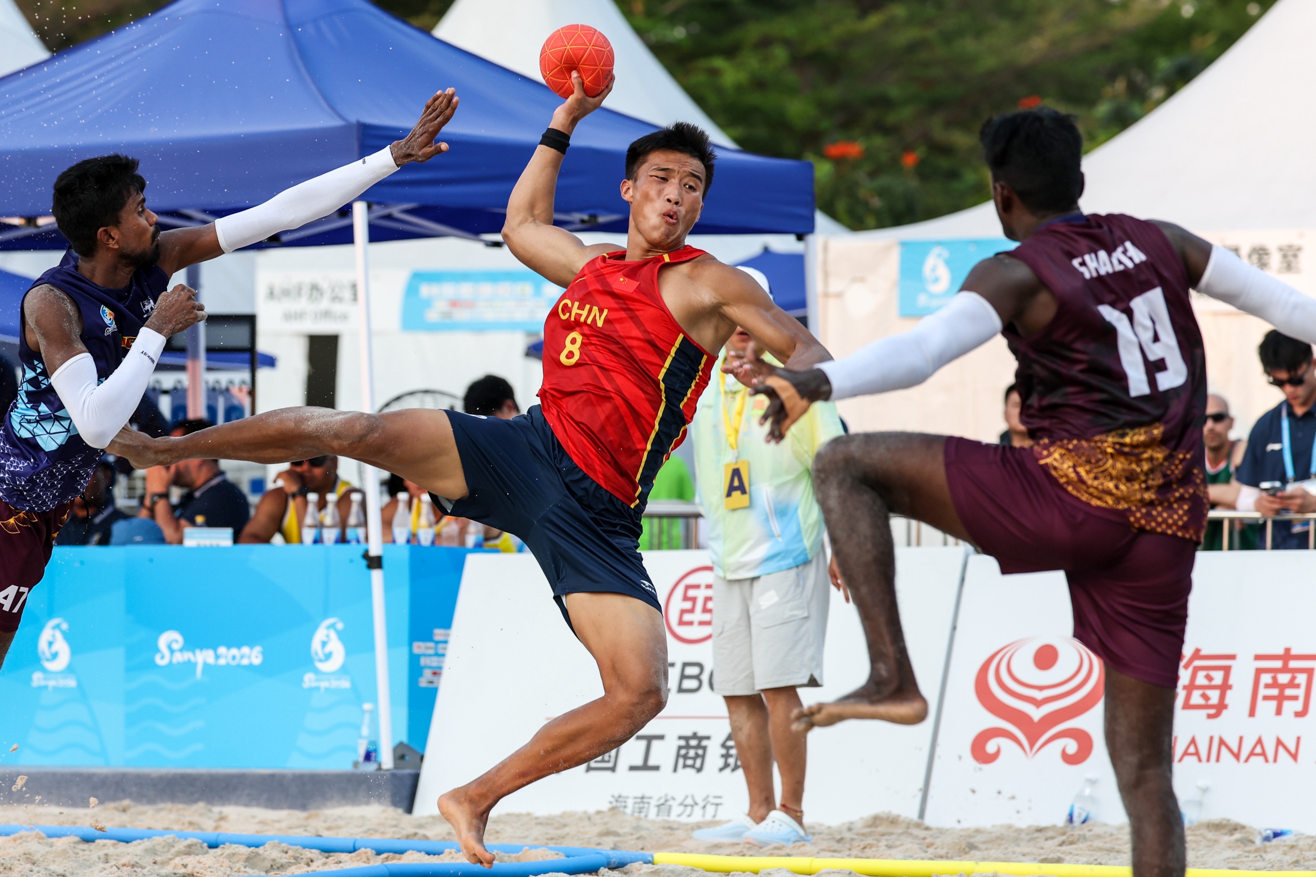 4月21日,在海南三亚举行的第六届亚洲沙滩运动会沙滩手球男子小组赛中,中国队2比0战胜斯里兰卡队。图为中国队球员马会锋(中)在比赛中进攻。(第六届亚洲沙滩运动会组委会供图)