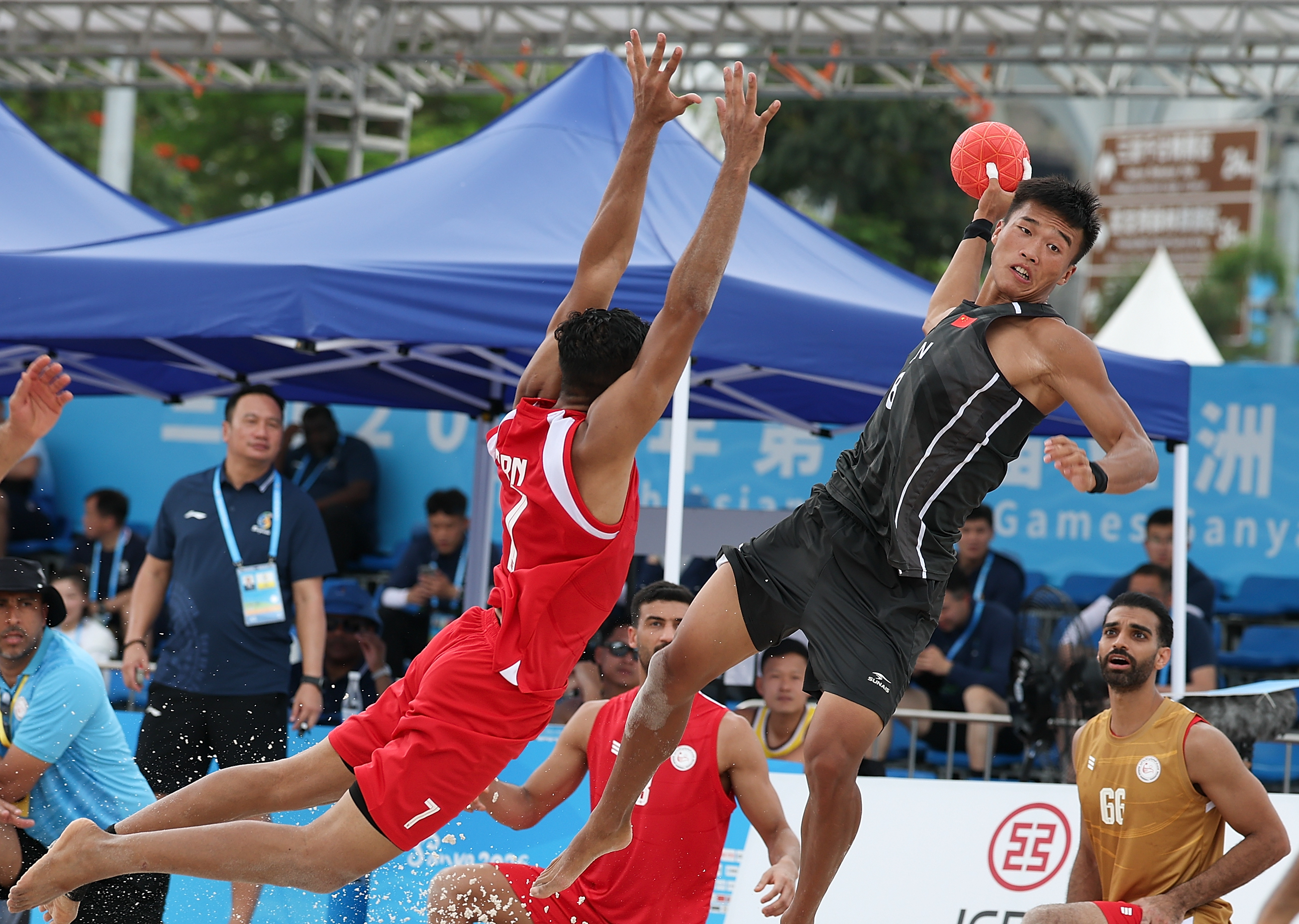 4月21日,在海南三亚举行的第六届亚洲沙滩运动会沙滩手球男子小组赛中,中国队0比2不敌巴林队。图为中国队球员马会锋(上右)在比赛中射门。(第六届亚洲沙滩运动会组委会供图)