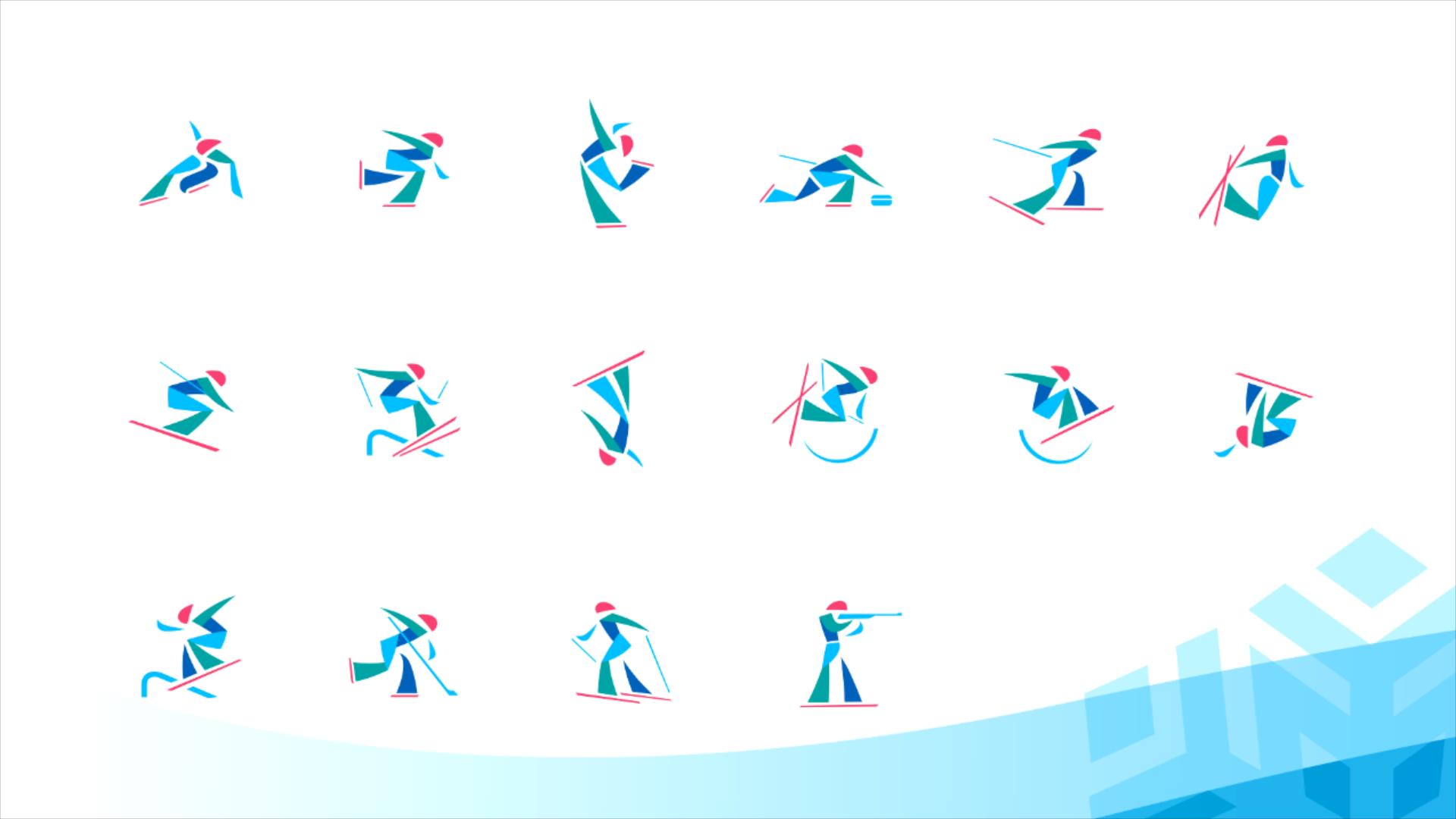 第九届亚冬会体育图标设计根据会徽“超越”造型衍生而来,沿用了会徽的视觉风格。体育图标共分为16个单项图标,视觉表现或刚劲有力,或飘逸优美,或充满激情,通过生动准确的运动形象来表现亚冬会的各个体育项目。