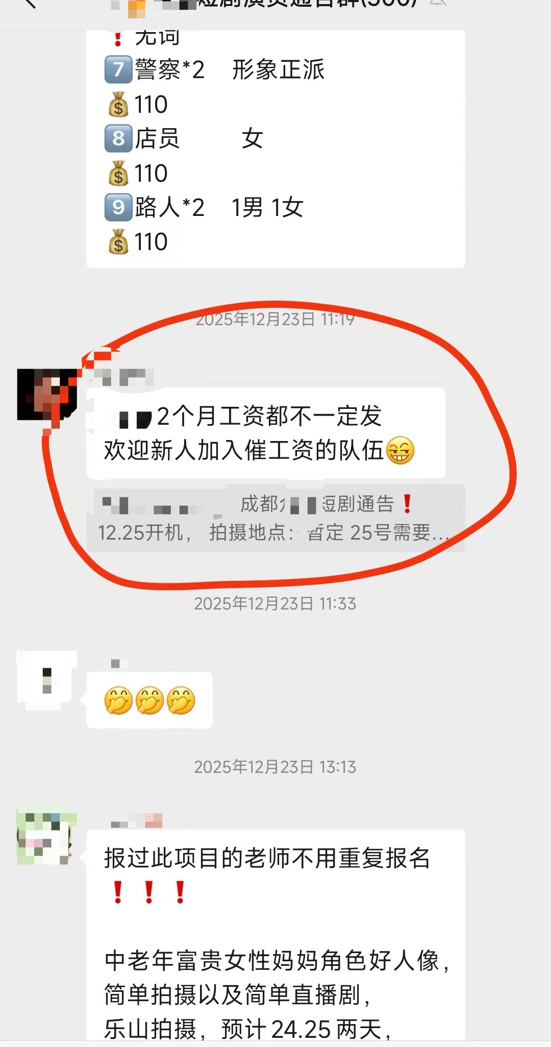 不光是有角色的演员,对于群演来说,欠薪事件也偶有发生,记者在成都某短剧演员群里发现,就在半个月前,便有人在某影视公司的演员征集信息中评论,“(该公司)2个月工资都不一定发,欢迎新人加入催工资的队伍。”或是曝光某个剧组介绍人,拿了剧组发给群演的工资,却迟迟不结账,甚至消失跑路。