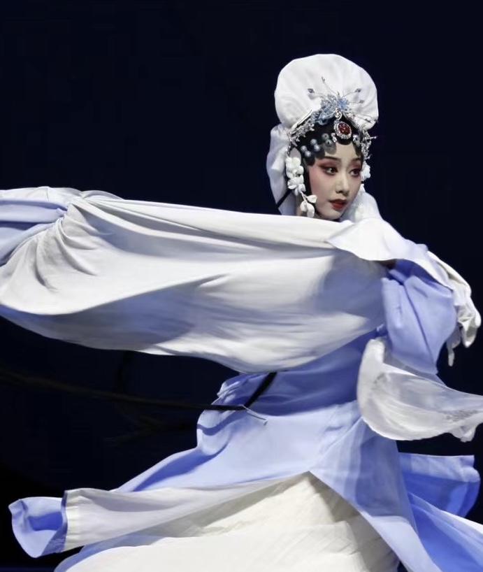 00后演员李雨洁在剧中饰演“八娘”,需要在唱演同时加入三米多长的水袖表演与考究基本功的小碎步。“水袖和小碎步都是技巧,每次上场前都得找感觉,说实话每一场演出我都有压力,生怕失误。”为了确保表演万无一失,李雨洁养成了上场前反复练习的习惯,后台走廊、马门前、候场间隙,只要有机会,她就会一遍遍地练习水袖动作,“有成功也有失败,但必须坚持练,让自己保持手感。”