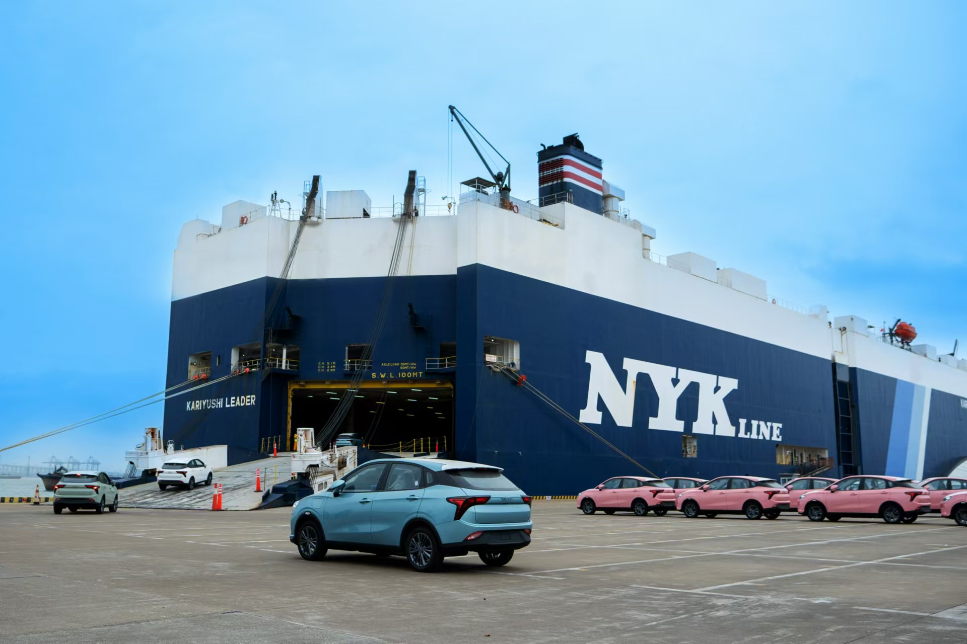 上海洋山港码头,运往泰国的哪吒汽车正在装入滚装船中。受访者供图