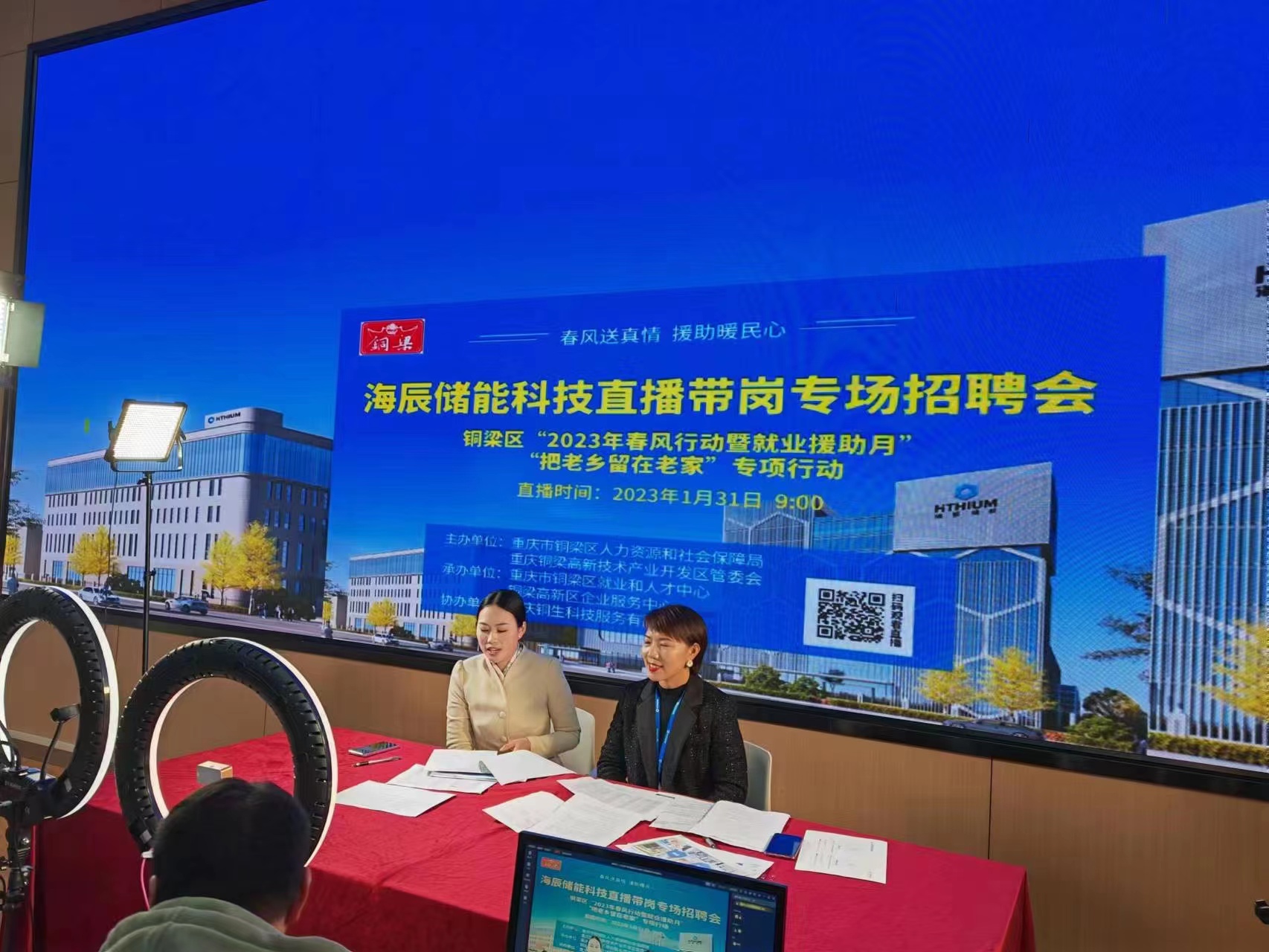上月底,铜梁区人力社保局、铜梁高新区管委会主办了“2023年春风行动暨就业援助月”“把老乡留在老家”专项行动,海辰储能科技推出了直播带岗专场招聘会活动,提供出工程师、业务主管、财务、专员等岗位2000余个。