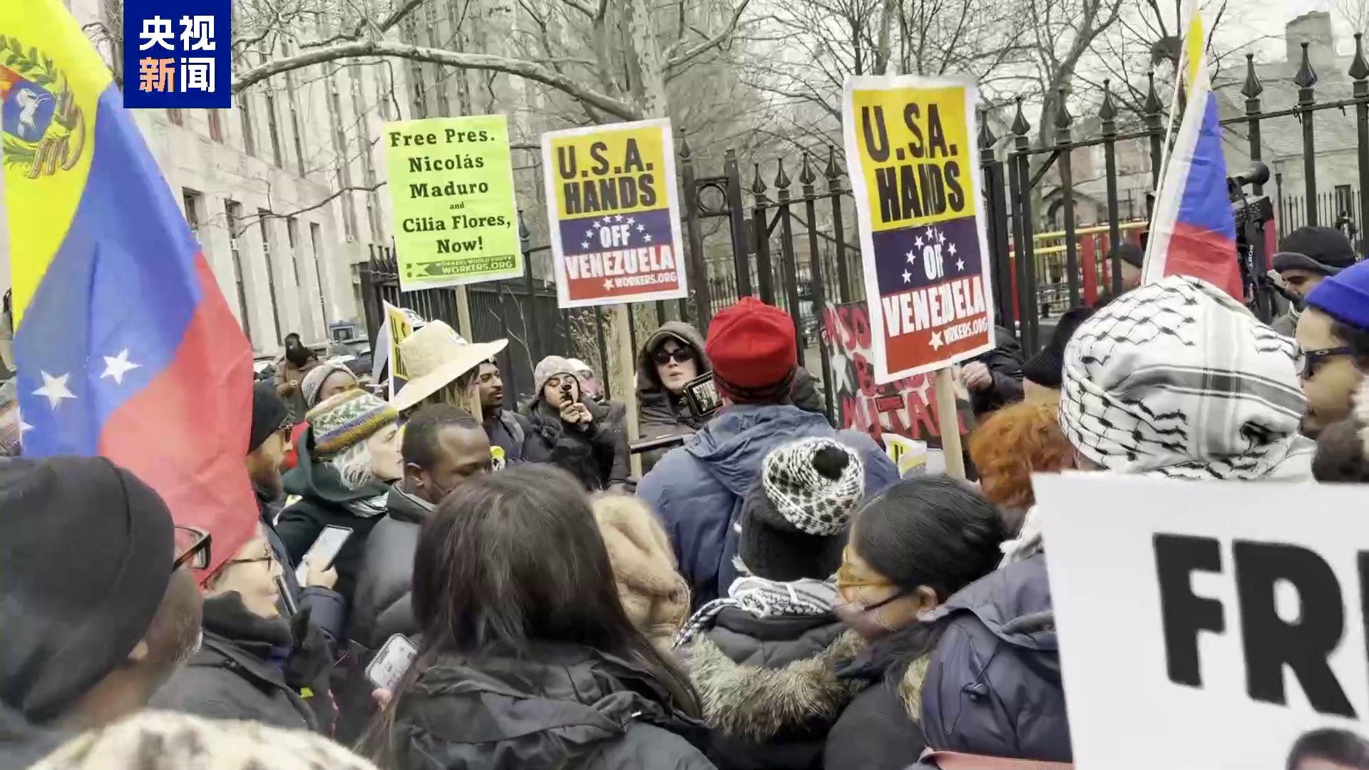 总台记者在现场看到,法院周边安保明显加强,多辆警车停靠在路口布防。民众在法院外广场及周边街道聚集,他们举着“释放马杜罗”“不要向委内瑞拉开战”等标语横幅,不时高呼口号,对美方行动表示不满。