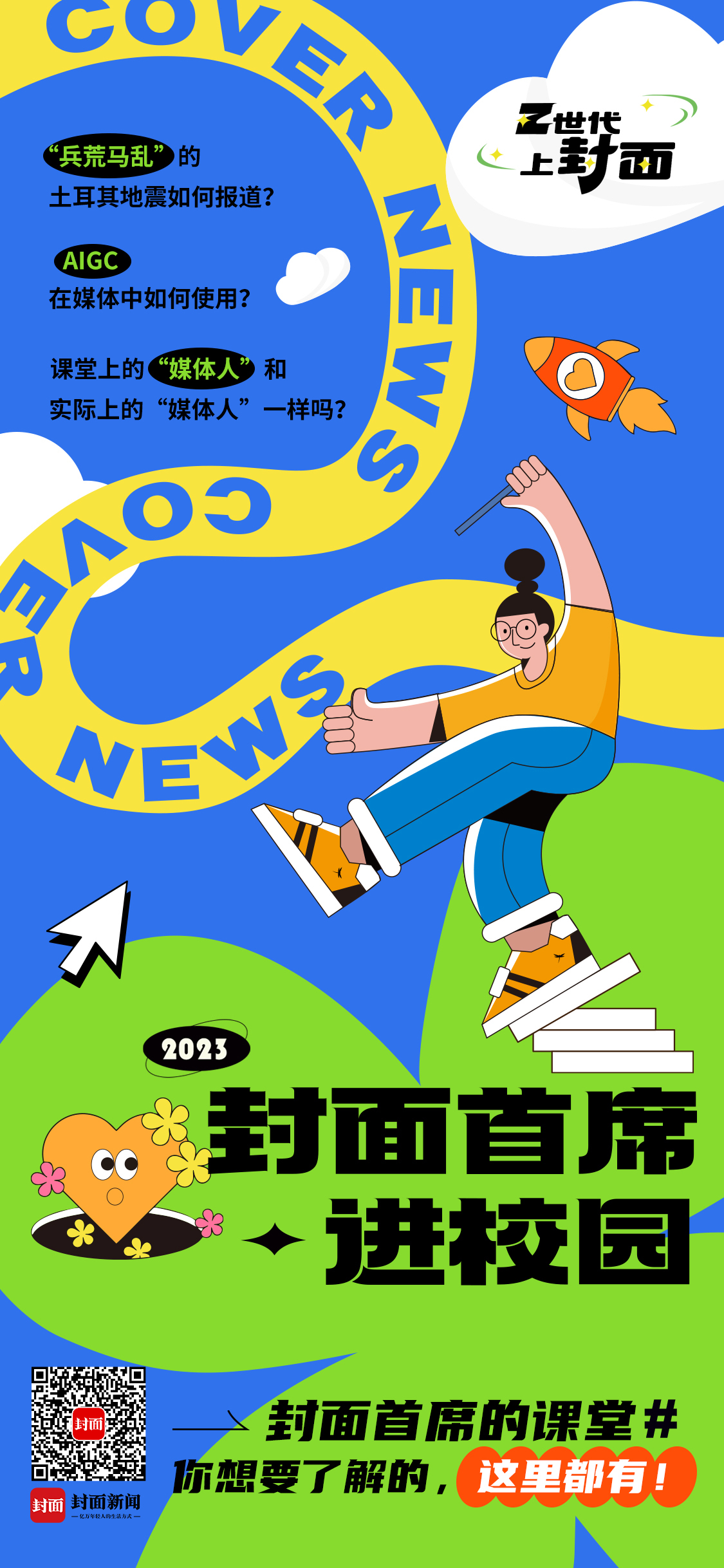 这个五月,封面新闻将走进高校,发起“Z世代 上封面”走进高校 打开“亿万年轻人的生活方式”,通过封面首席进校园、“封面青年通讯团”计划、青蕉校园博主计划、青蕉拍客养成计划等,聚焦时代新声,走近“Z世代”。