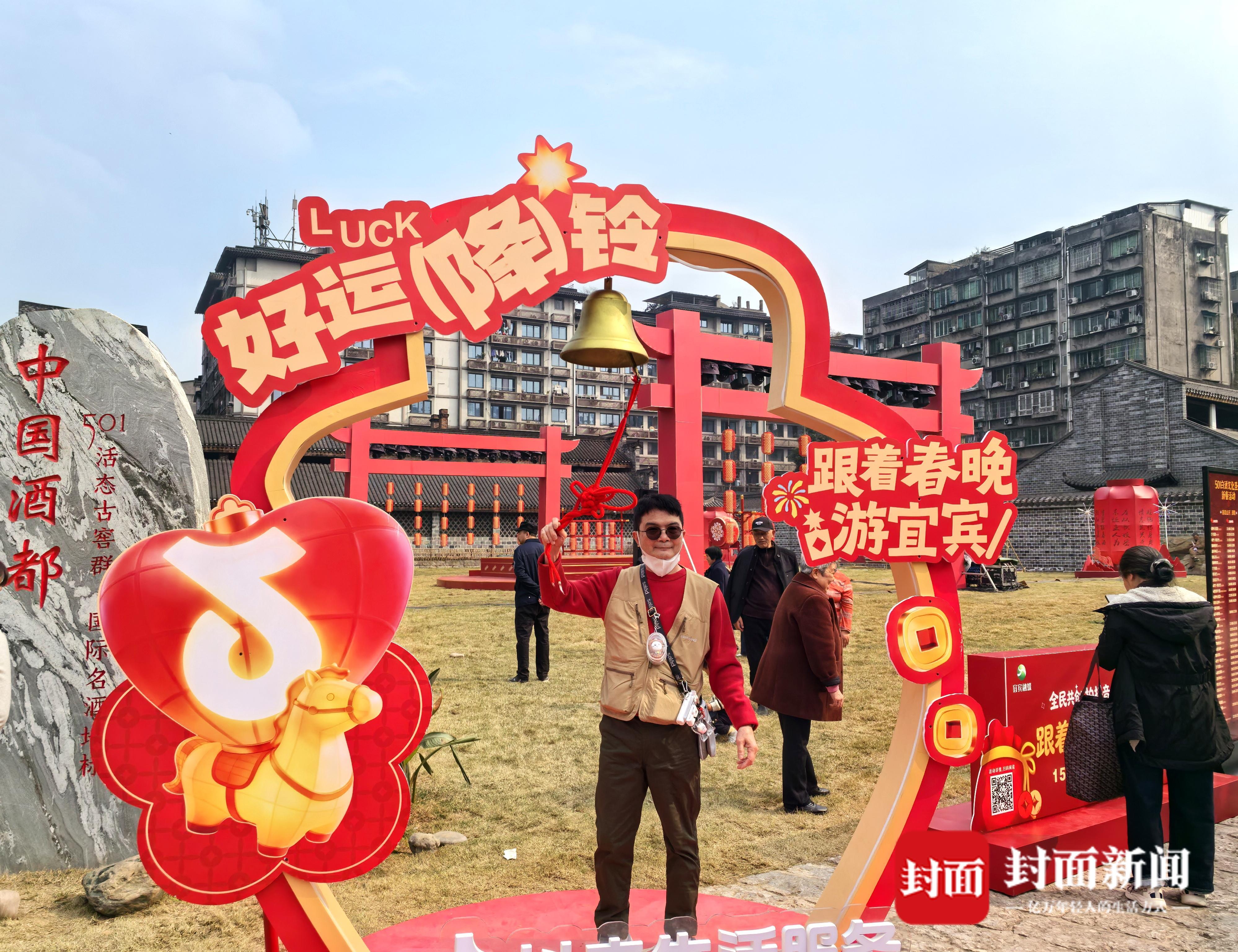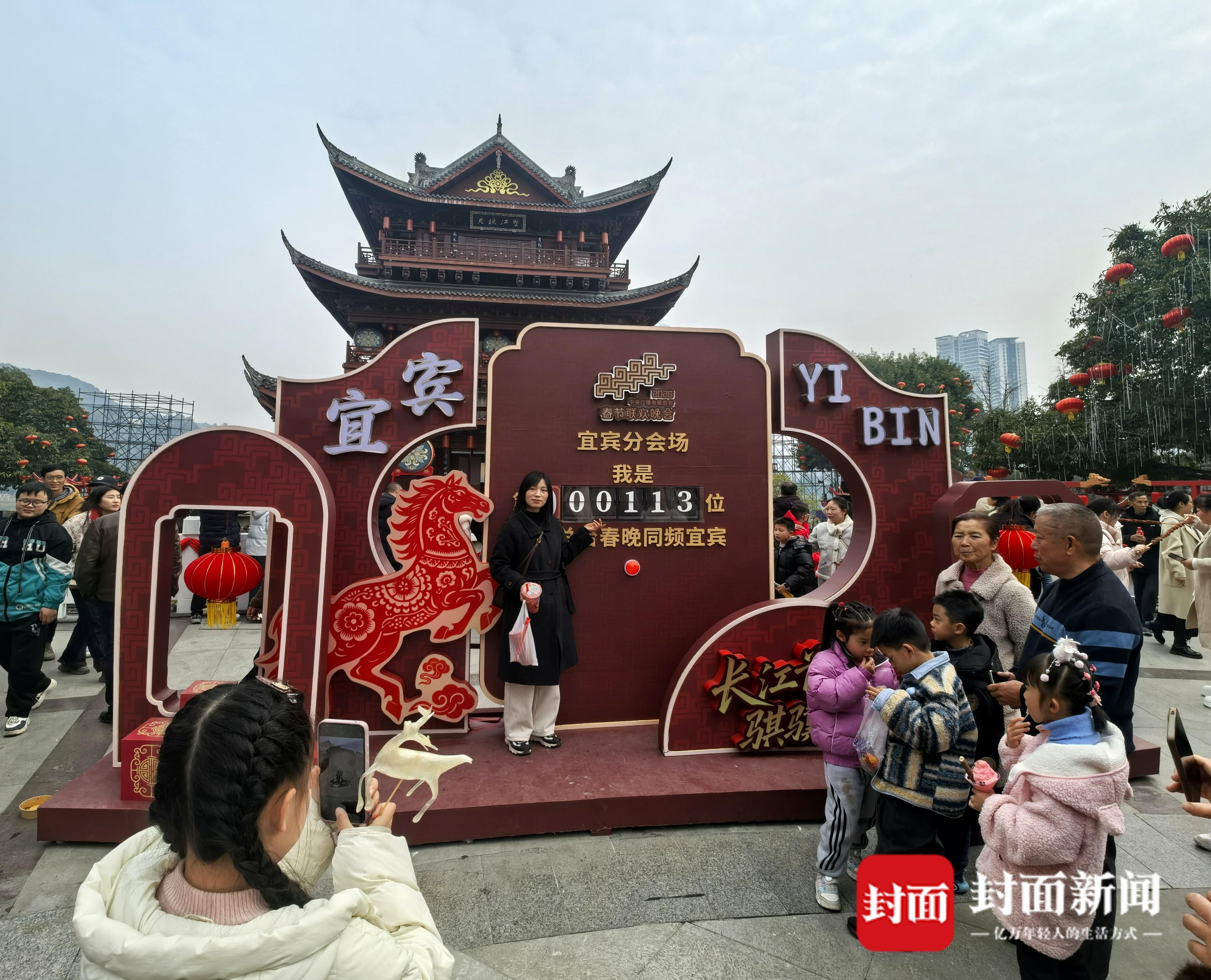 游客在总台春晚宜宾分会场打卡点与春晚“同框”。