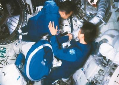 11月30日,在酒泉卫星发射中心拍摄的神舟十四号航天员陈冬(右)在天和核心舱气闸舱迎接神舟十五号航天员乘组的画面。新华社记者 郭中正摄