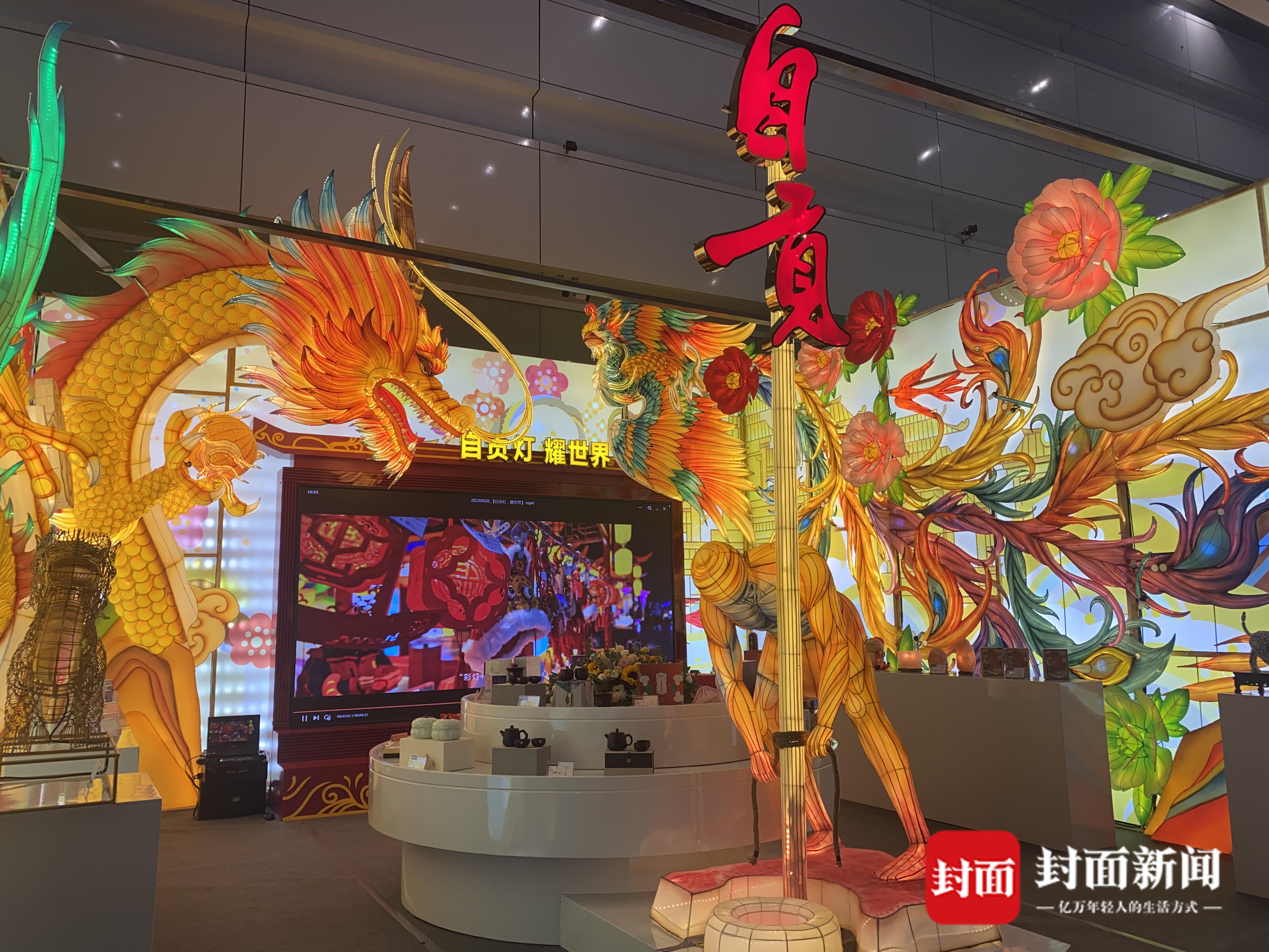 自贡展厅的工作人员介绍,展厅入口左右两侧放置的是自贡彩灯和故宫文创相结合的宫廷灯笼。左侧墙面以半浮雕结合高浮雕工艺布置“巨龙腾飞”,右侧同样布置“彩凤展翅”,龙凤呈祥衬托出自贡这座美丽城市的蓬勃发展。“正在与大家互动的是自贡特有的仿真恐龙。目前自贡有涉彩灯、仿真恐龙业务企业1000余家。”