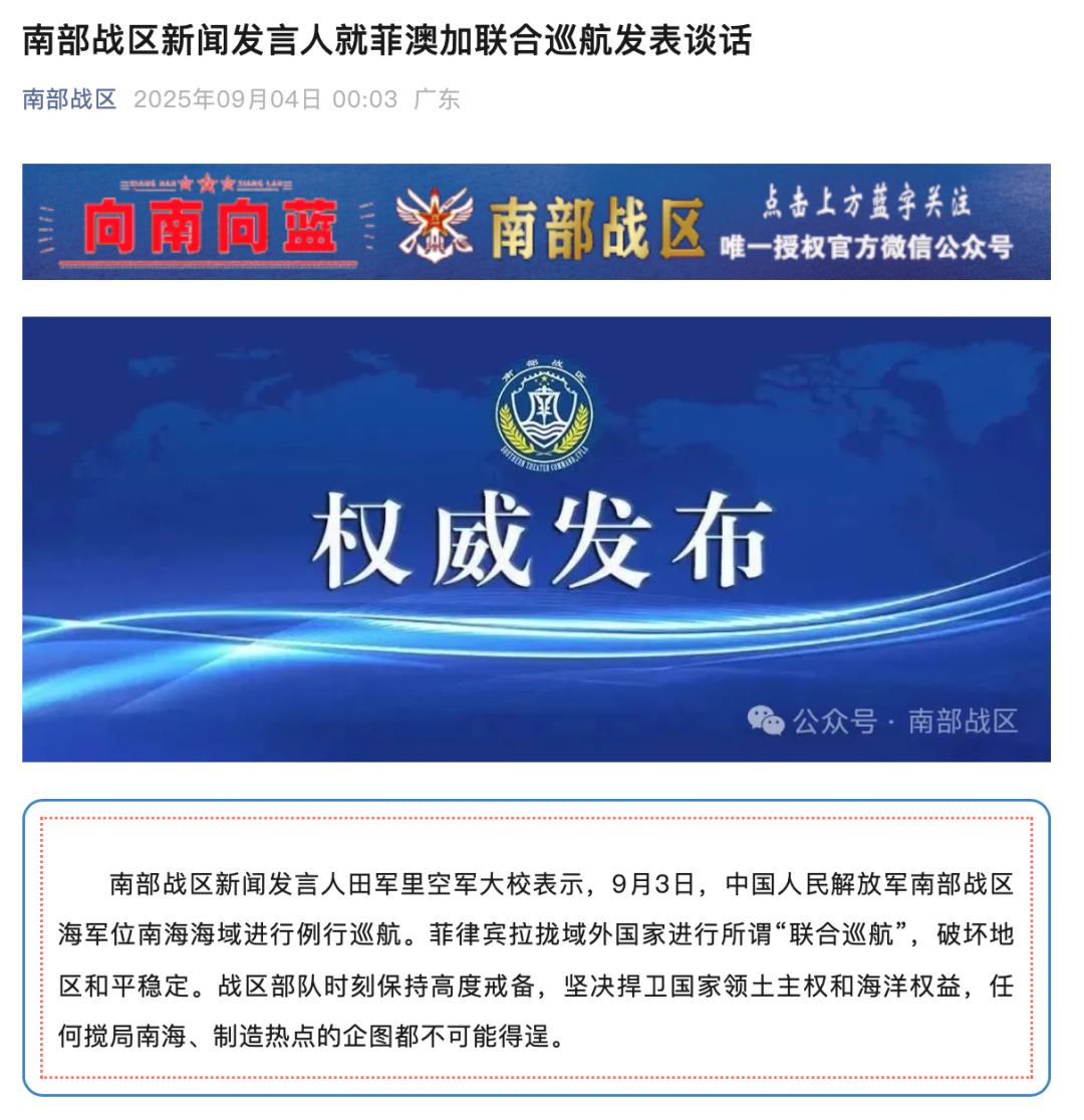 据“南部战区”微信公众号9月4日凌晨消息,南部战区新闻发言人就菲澳加联合巡航发表谈话。
