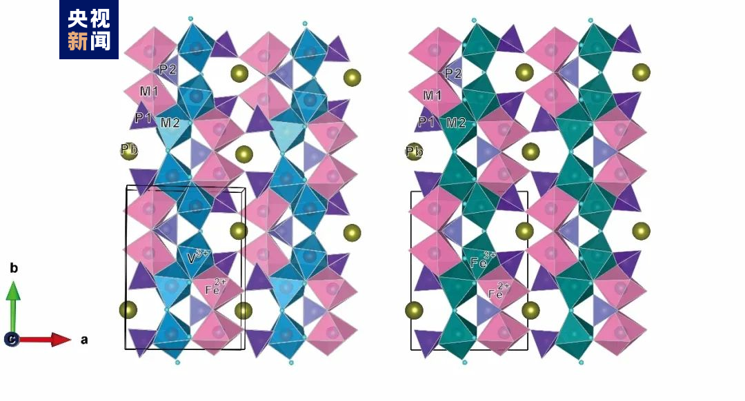 褐磷钒铁铅石和绿磷铁铅石均属于绿磷铝钡石族。这两种磷酸盐新矿物的晶体结构特征与绿磷铝钡石族其他矿物相似,均为单斜晶系,空间群为:P21/m(#11)。V-O八面体或Fe3+-O八面体共棱成对,再共角顶连结成平行b轴的链。Fe2+-O八面体亦共棱成对,八面体对与八面体链共棱连结。P1-O四面体连接八面体链,P2-O四面体连结两种八面体对,Pb2+位于结构的大孔隙中。