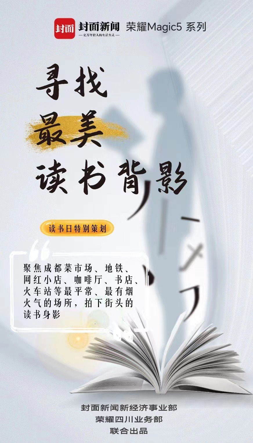 春风四月,是读书月,也是奋发向上的新开始。封面新闻推出【专注4月,一起全民悦读】大型策划。我们联合荣耀手机发起“寻找最美读书背影”征集活动,邀请大家在城市街头巷尾寻找放下手机,专注阅读的身影,一起感受成都这座快节奏城市慢下来的那一面。