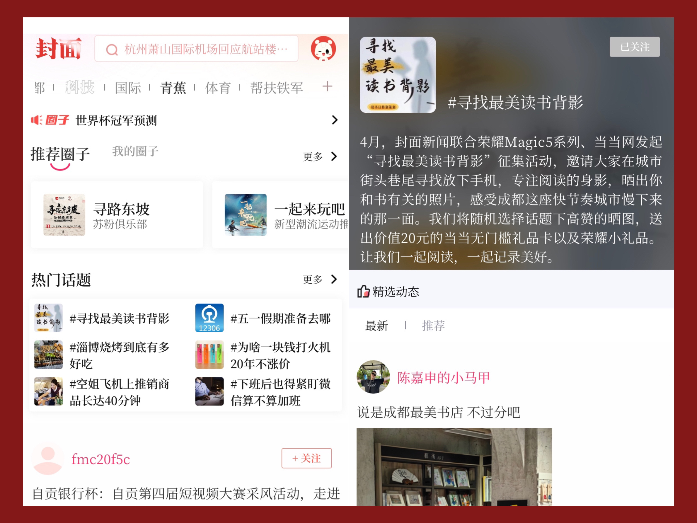 活动参与路径:【封面新闻APP-青蕉频道-热门话题-#寻找最美读书背影-发动态】