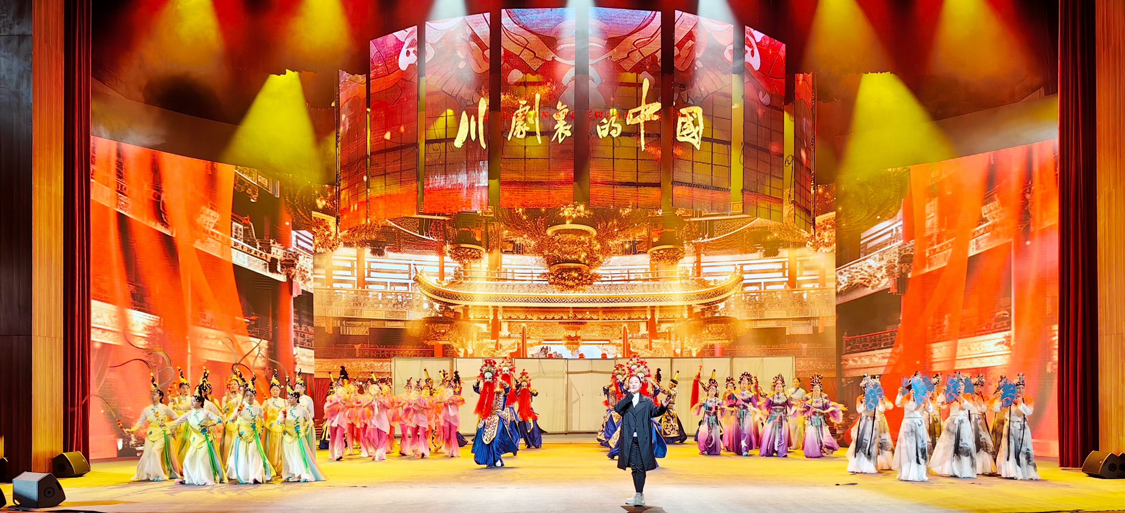 《川剧里的中国》演出时间约一个半小时,由序曲“川腔锦绣”和“人间有川戏”“培根铸戏魂”“梨园存浩气”“戏海汇万涓”“梨园正芳菲”五大篇章以及尾声组成。