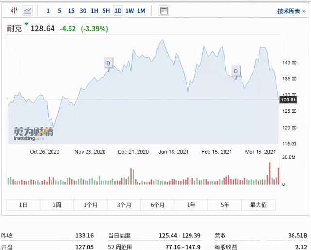 耐克美股昨夜收盘跌3.39% 市值蒸发约463亿元人民币