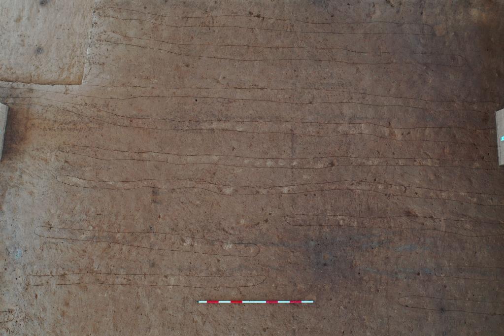 考古工作者还在叠压于宫殿建筑之上的地层中,清理出成片分布的由田间道路、沟渠、水井、田地等组成的汉代农田,农田中还可清晰看到较规律分布的犁沟、牛蹄印,这是第一次在秦汉都城附近发现的农业景观。