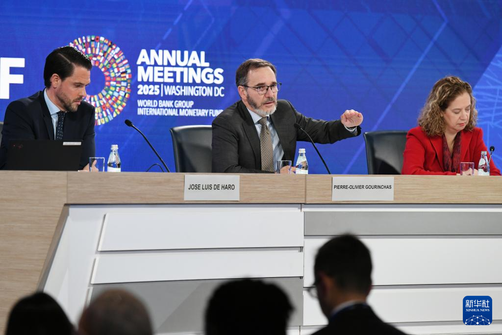 10月14日,在美国华盛顿,国际货币基金组织首席经济学家皮埃尔-奥利维耶·古兰沙(中)在《世界经济展望报告》新闻发布会上讲话。新华社记者 李睿 摄