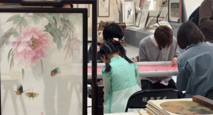 在河南开封清明上河园等景区内,各大非遗市集人头攒动。在汴绣工坊内,游客穿针引线,体验宋绣的细腻雅致;朱仙镇木版年画作为国家级非遗,游客排队体验手工拓印,在实践中感受非遗之美。