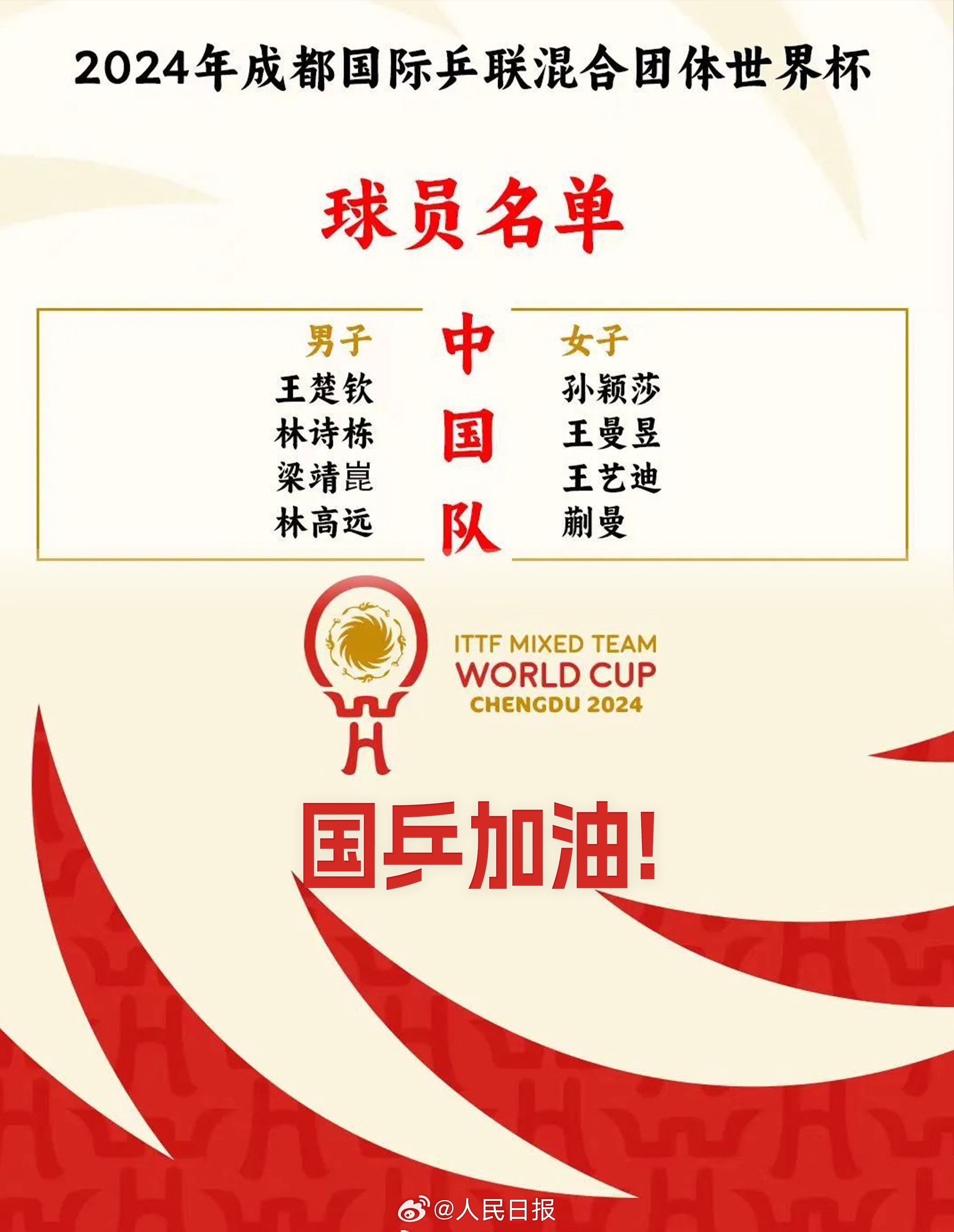 国乒加油!成都混团世界杯名单出炉 人民日报 2024-11-11 14:47 44024 2024年成都国际乒联混合团体世界杯将于12月1日至8日在中国成都举行。国际乒联于今日正式公布参赛球员名单,中国队名单如下:男子:王楚钦、林诗栋、梁靖崑、林高远女子:孙颖莎、王曼昱、王艺迪、蒯曼 评论 12 飞奔的水哥 2024-11-11 发表于四川 成都加油,期待比赛! 艾泽磊 2024-11-11 发表于四川 林高远混双确实是天王级别,大迪在这一年配对下混双成绩十分不错,拎出来在世排成绩也是一流水平。结果应该可以说是实至名归。 小小修罗 2024-11-11 发表于四川 比赛加油,胜利属于我们! 查看更多