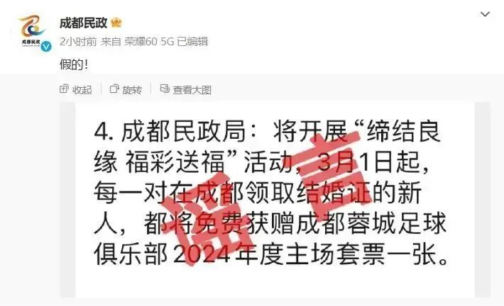 谣言:成都领结婚证送足球套票?