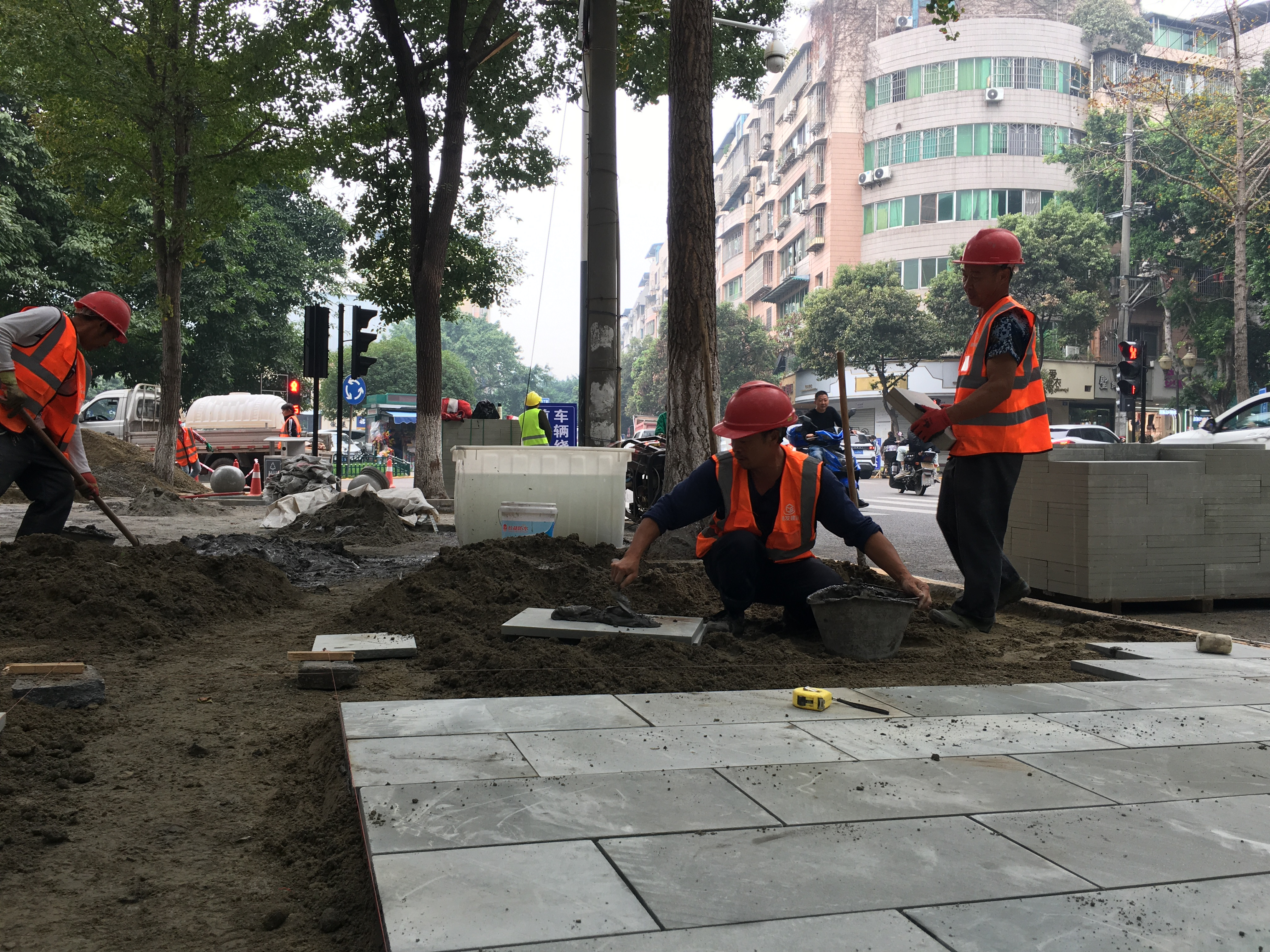 10月25日,四川隆昌市中心街人行道上,挖掘机正在拆除清理原有方块砖,部分人行道完成浇筑5cm厚的混凝土垫层环节,工人们正相互配合铺筑青石板。