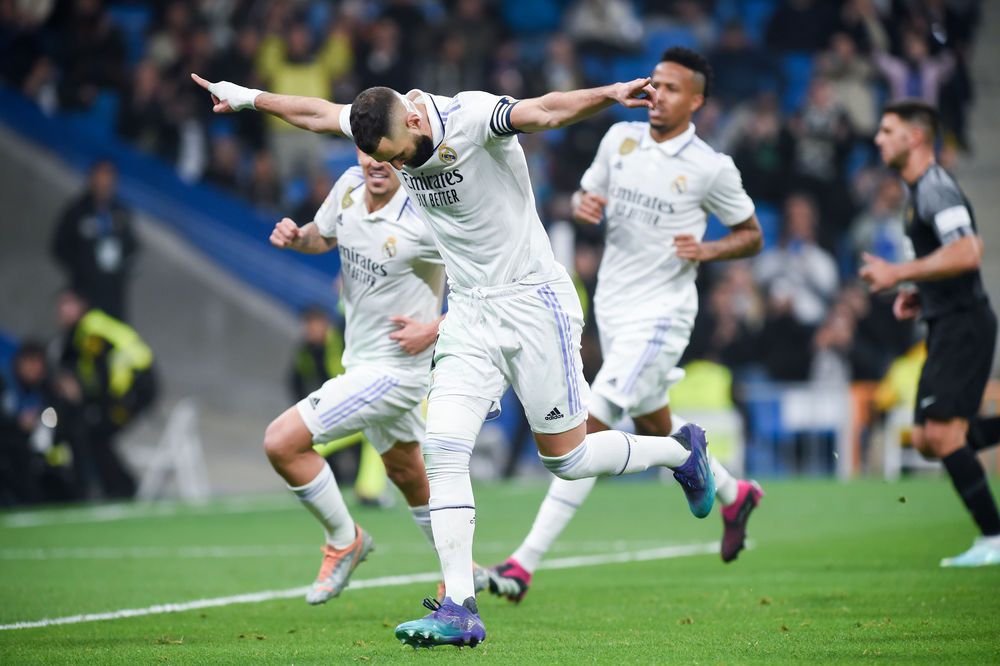 2月15日,皇家马德里队球员本泽马(前)在比赛中庆祝进球。新华社发(古斯塔沃·巴连特摄)