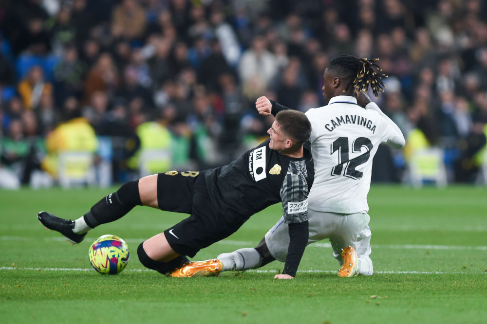 2月15日,皇家马德里队球员卡马文加(右)在比赛中与埃尔切球员劳尔·古蒂拼抢。新华社发(古斯塔沃·巴连特摄)