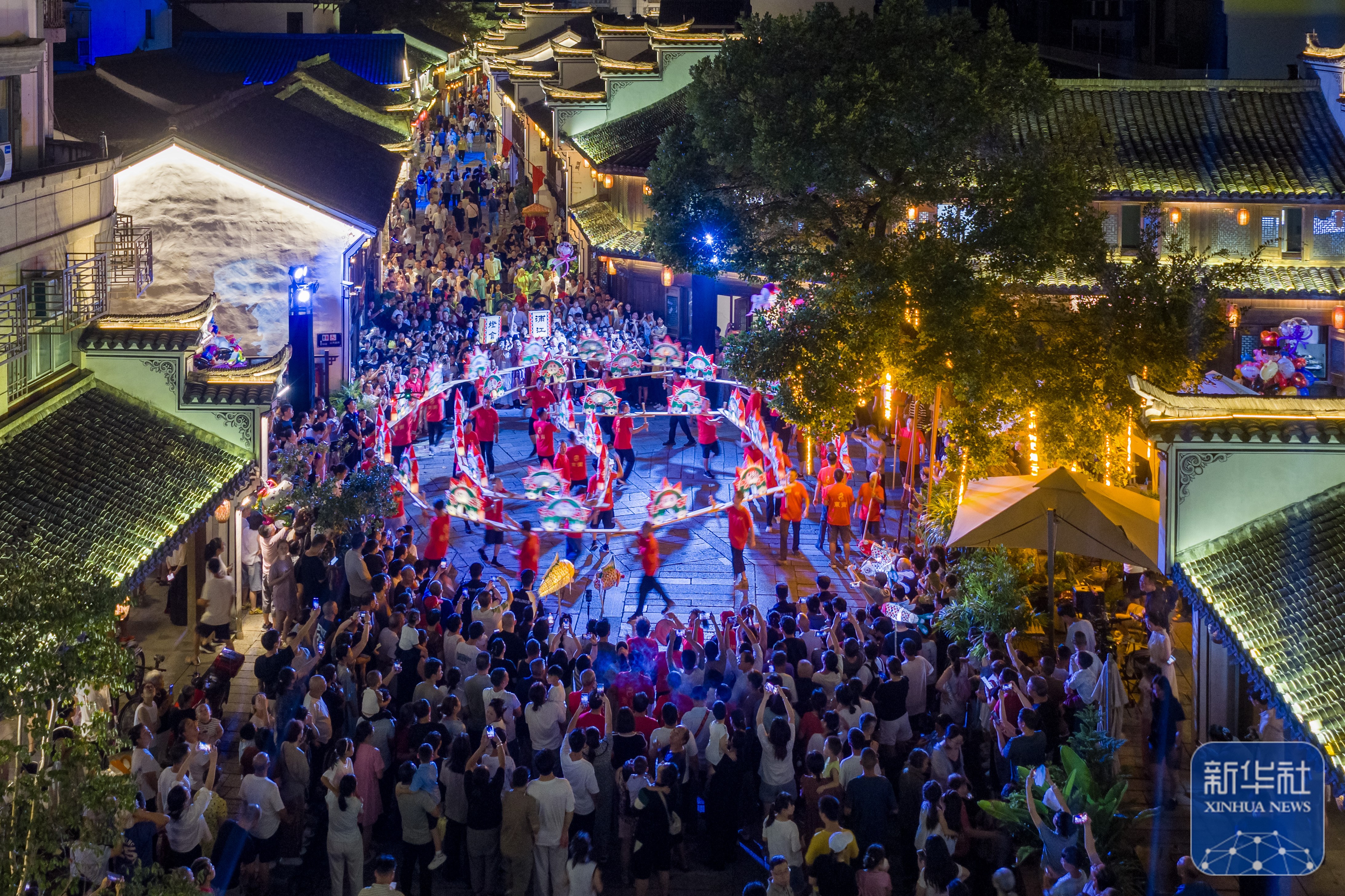 ↑ 10月5日,游客在浙江省浦江县东街历史文化街区欣赏板凳龙巡游(无人机照片)。新华社发(张辉摄)