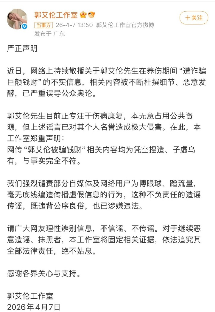 郭艾伦工作室发表声明称,“网传‘郭艾伦被骗钱财’相关内容均为凭空捏造、子虚乌有,与事实完全不符。郭艾伦目前正专注于伤病康复。”