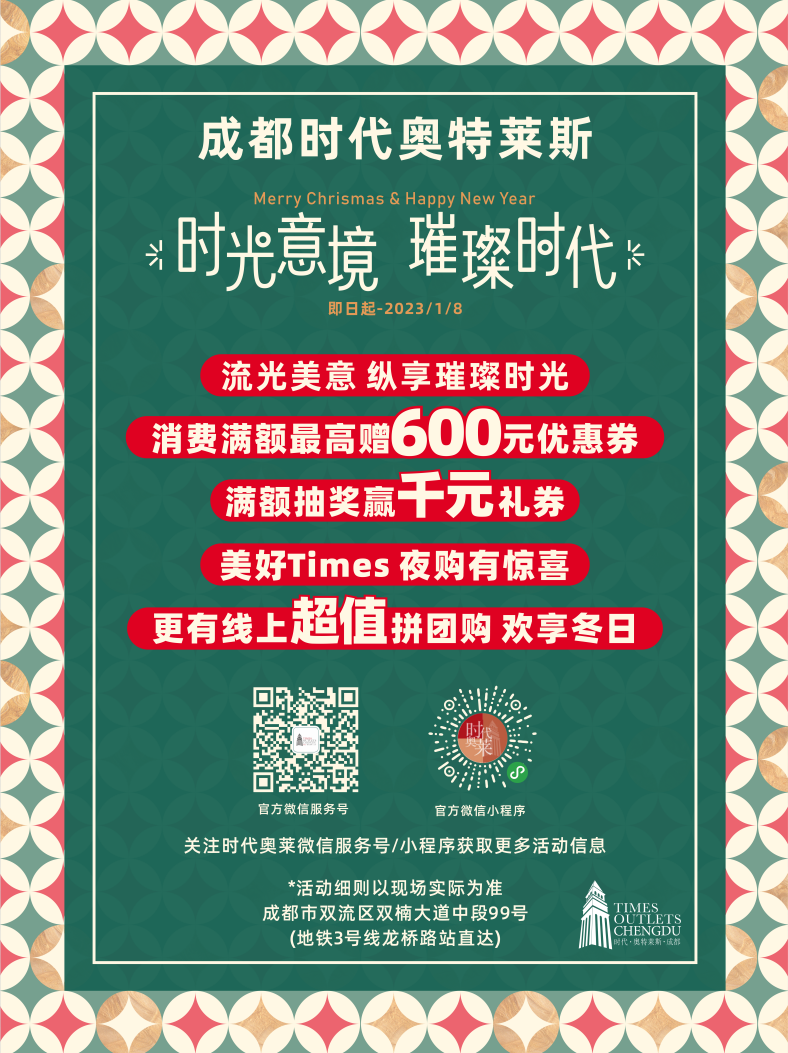 当年末超强折扣季遇见璀璨时代,叠加惊喜即刻释放,时代奥特莱斯“时光意境 璀璨时代”系列活动,还有更多值得挖掘的快乐,元旦假日,来成都时代奥莱收获独一无二的限量惊喜吧!