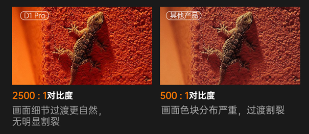 其次是对比度,优秀的画面显示,除了提高亮度以外,更重要的是控制黑位,也就是全黑画面下控制漏光的能力。对比度差的投影仪在进行侧投时,显示画面意外会有明显的发白画面,这就是黑位控制不好的原因。