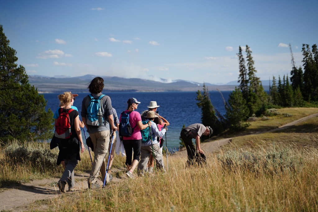 2019年9月2日,游客在美国黄石国家公园黄石湖畔徒步。新华社记者韩芳摄