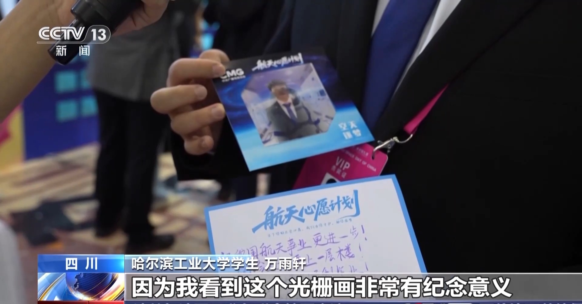 哈尔滨工业大学学生 万雨轩:这个光栅画非常有纪念意义。此时此刻,我在这里参加了中国航天日,在这里我感受到了我们国家在航天领域的强大。