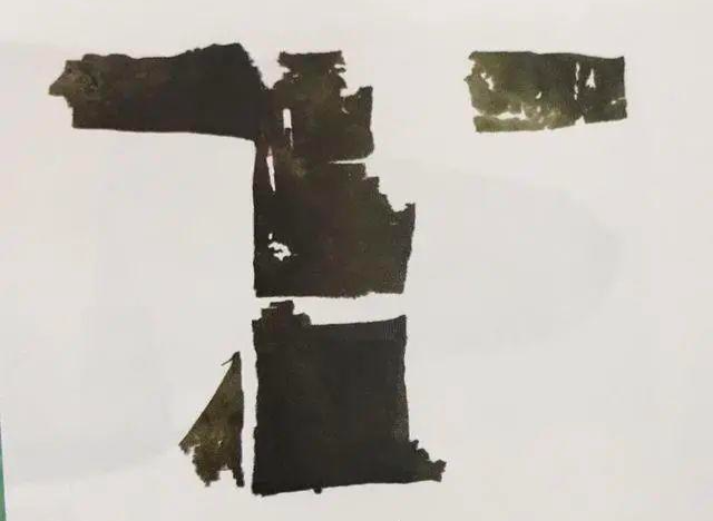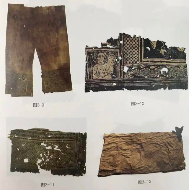 尼雅遗址出土汉晋时期棉布裤子、两件蓝色蜡染棉布残片、棉布方巾。