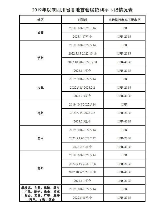 9月1日下午,人民银行四川省分行官网发布消息,公布了近几年四川省内各城市首套房贷款利率下限执行情况。