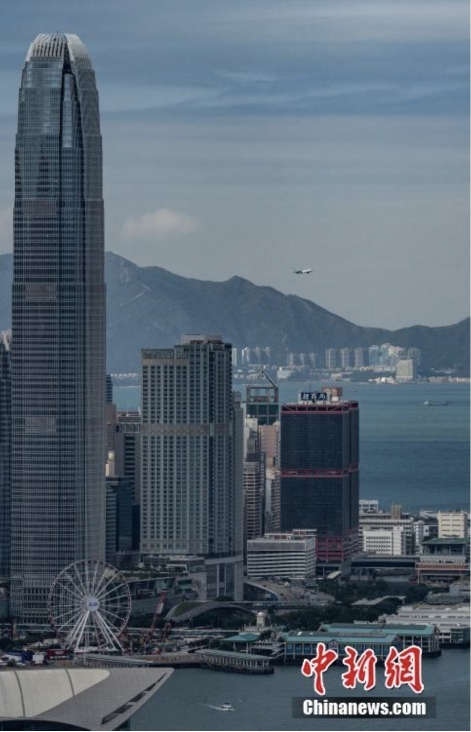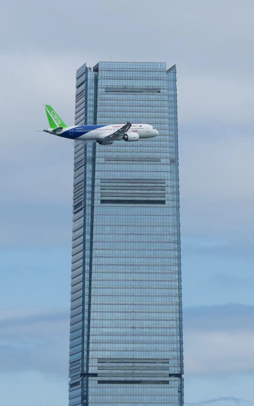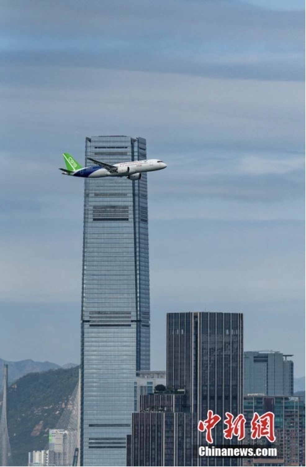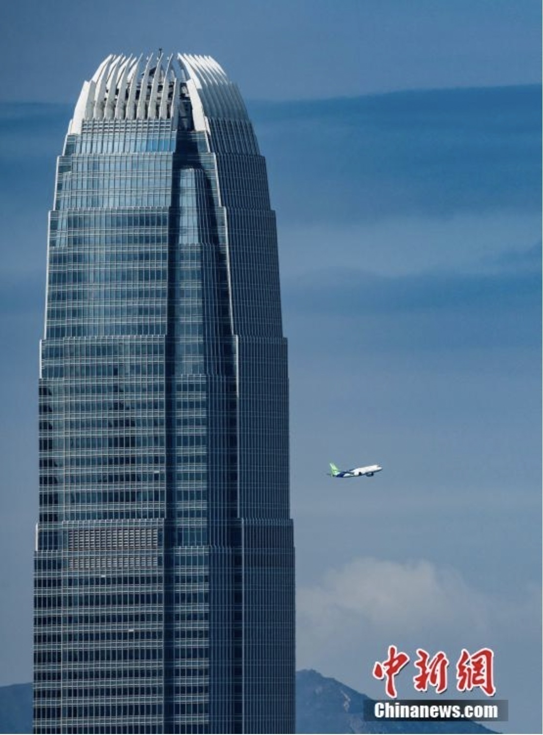 图为C919飞临维多利亚港上空,经过中环高层建筑国际金融中心二期