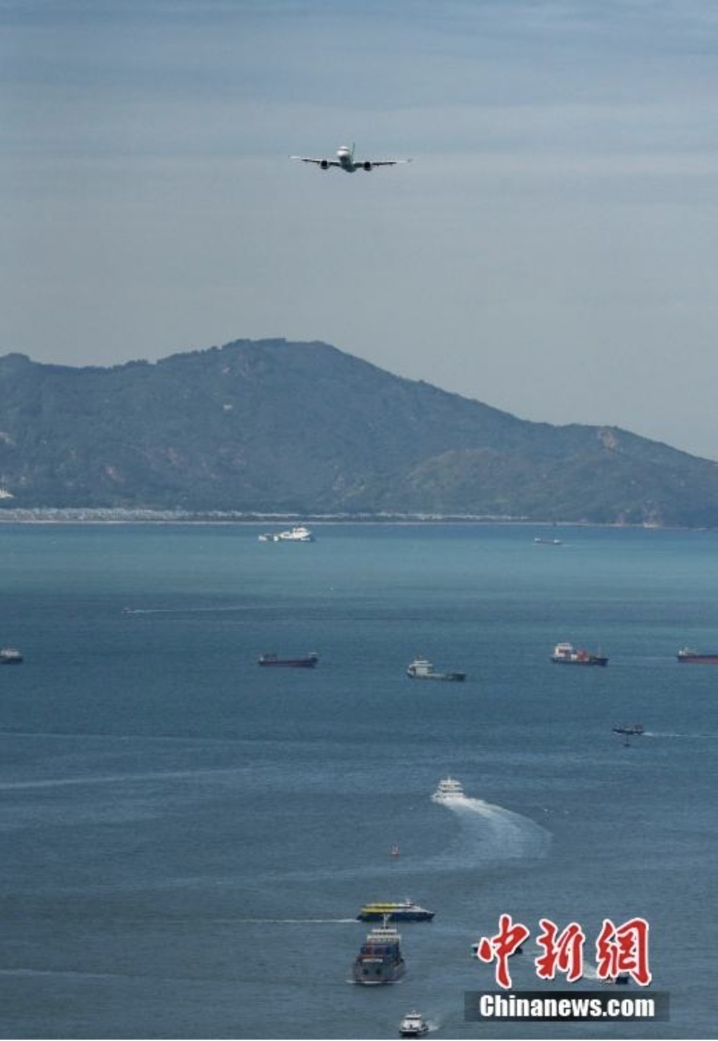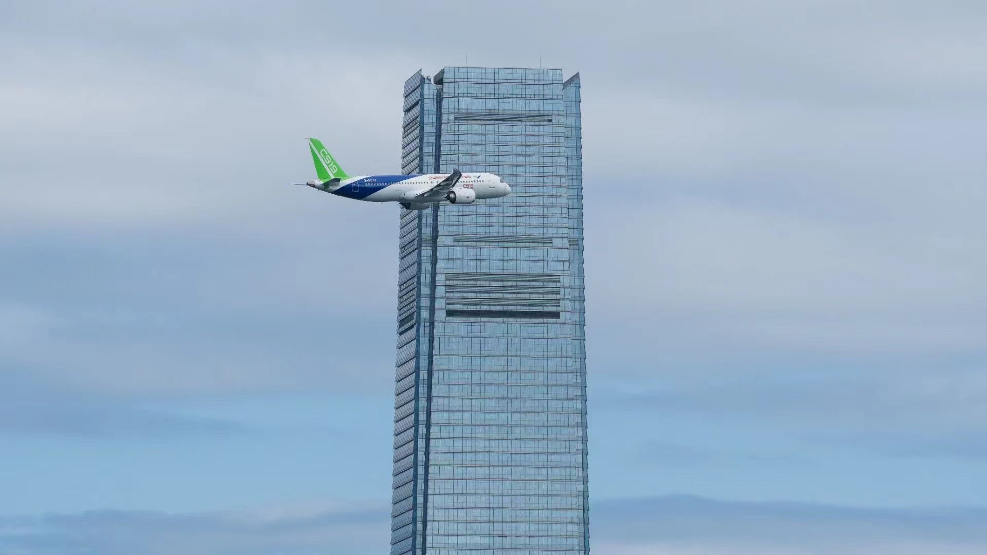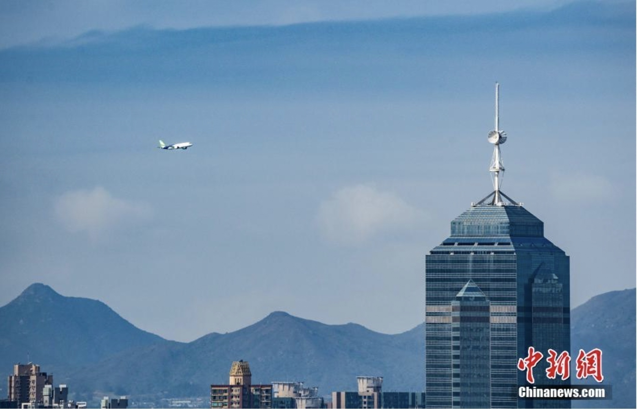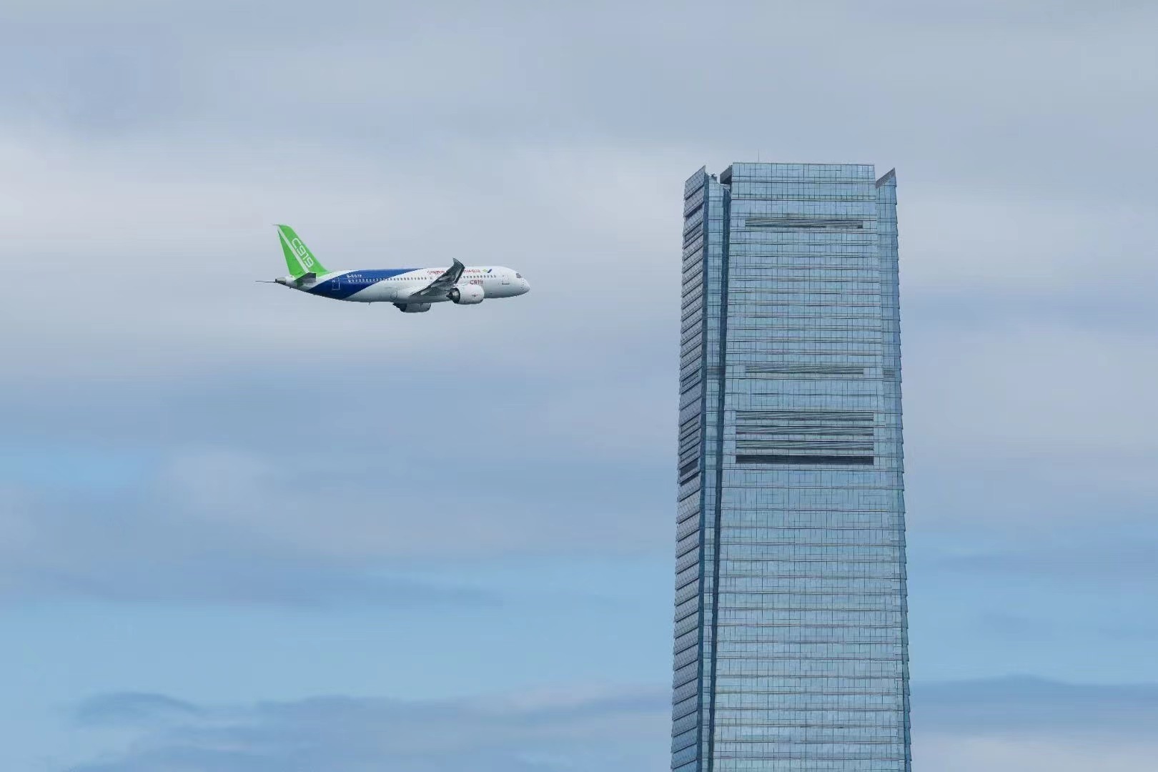 图为C919飞临维多利亚港上空,经过中环高层建筑国际金融中心二期