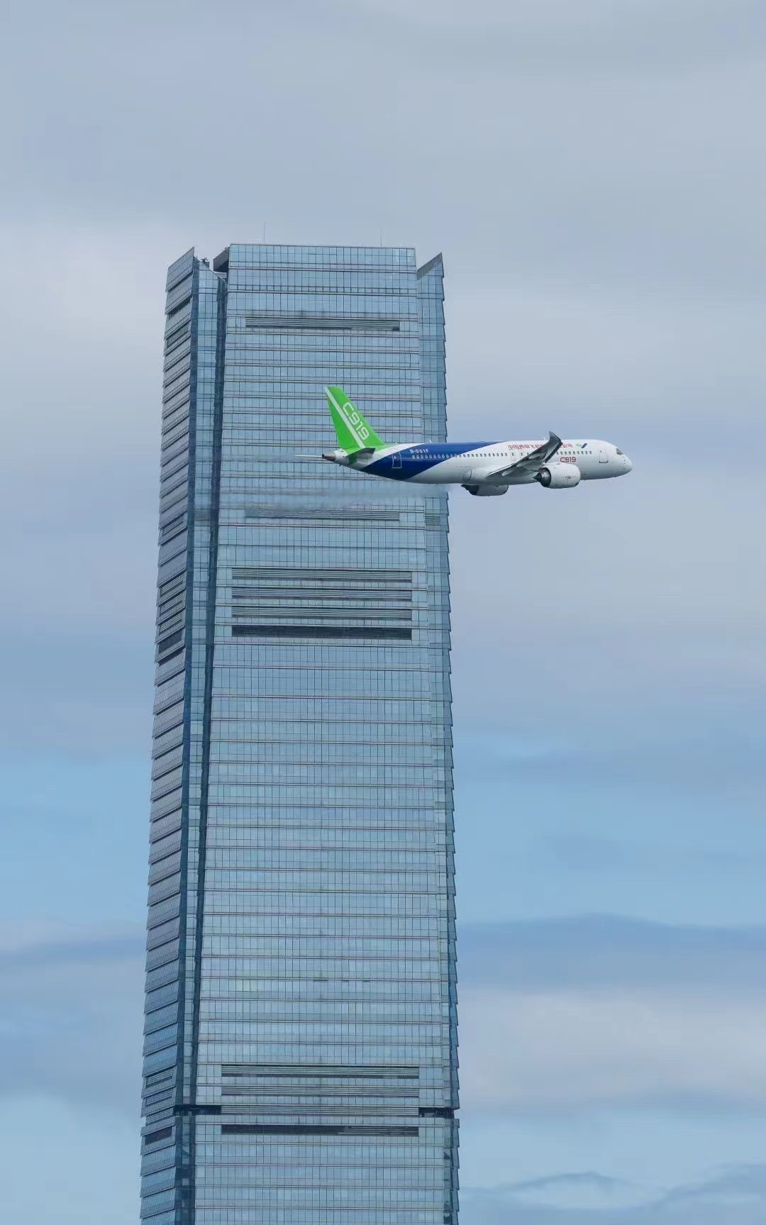 以上图为国产大飞机C919飞越维港上空,掠过香港最高楼环球贸易广场ICC一刻。摄影:李海琳