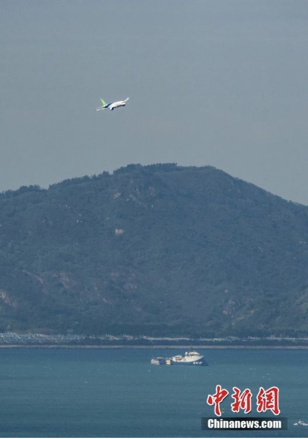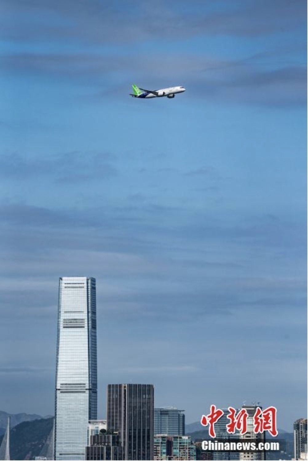 12月16日,中国国产大飞机C919在香港维多利亚港上空进行飞行展示。10时30分许,C919从香港国际机场起飞,自西向东飞越维港上空,并环绕香港岛两圈。众多市民及航空爱好者在维港两岸、太平山顶及宝马山顶等高地目睹C919风采。