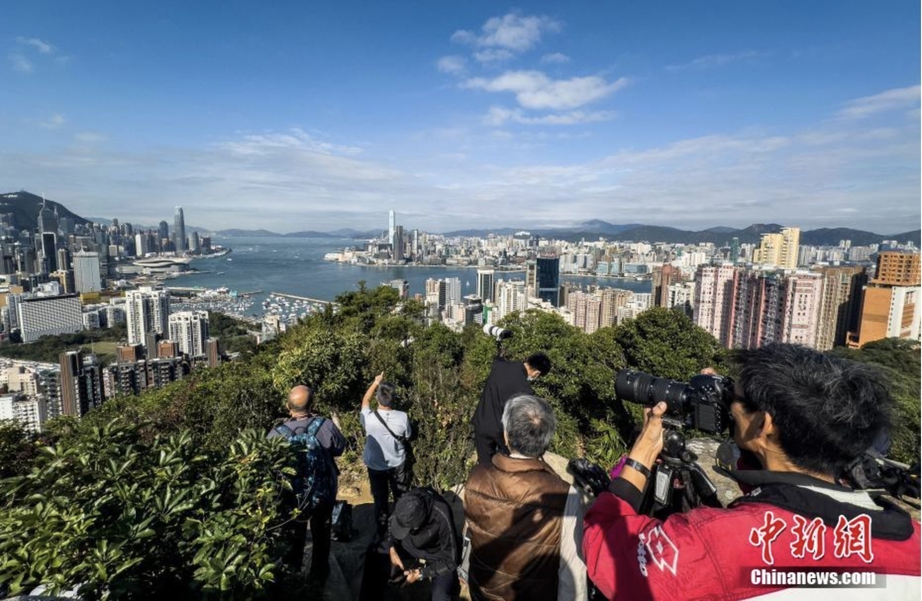 图为香港市民及航空爱好者在宝马山顶拍摄C919
