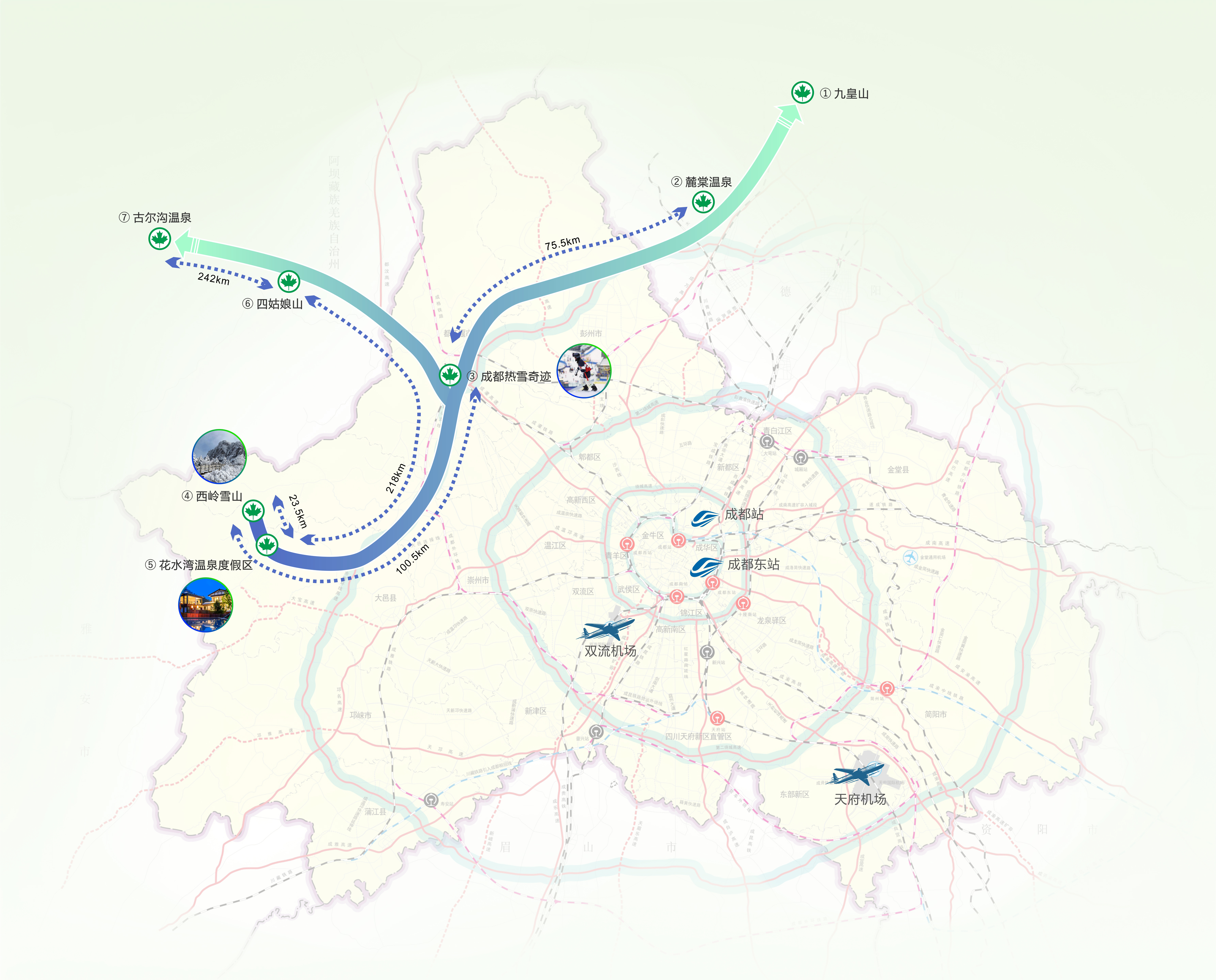 第四条是川西雪山温泉康养度假自驾线,以“温泉康养”为核心的线路,依托成都都市圈环线高速、成万高速、大西路等主要道路串联7个成都及川西雪山温泉康养度假地(其中5A级2个、4A级3个),融合“雪山探险”与“温泉疗养”的康养度假之旅。