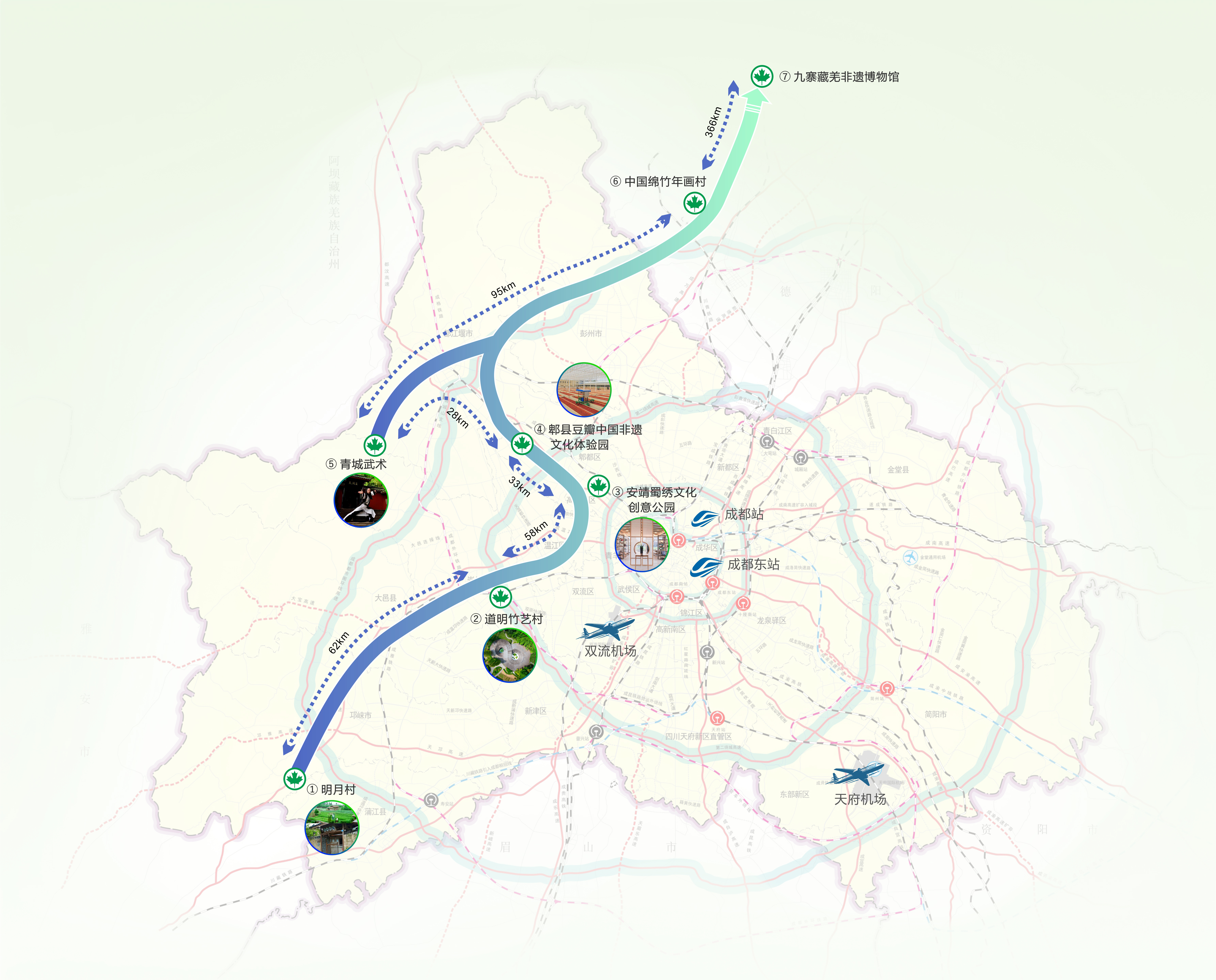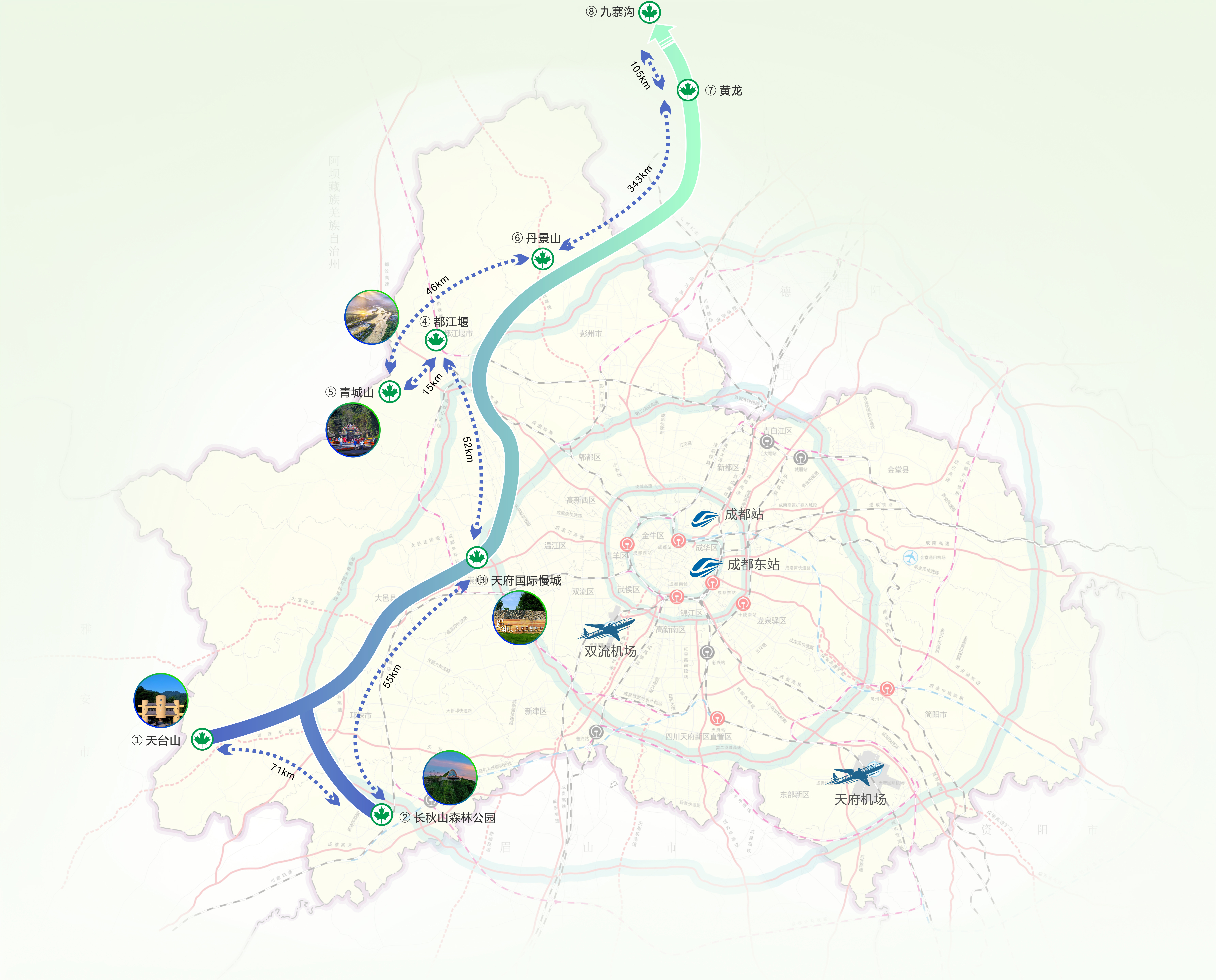 第三条是山水自然天府风光揽胜线,以“自然景观递进”为核心的线路,依托川青铁路,成都都市圈环线高速、成名高速、青城山大道、寿高路等主要道路串联8个成都及川西自然天府风光秘境(其中5A级5个、4A级2个),尽显地貌与景致的丰富层次。