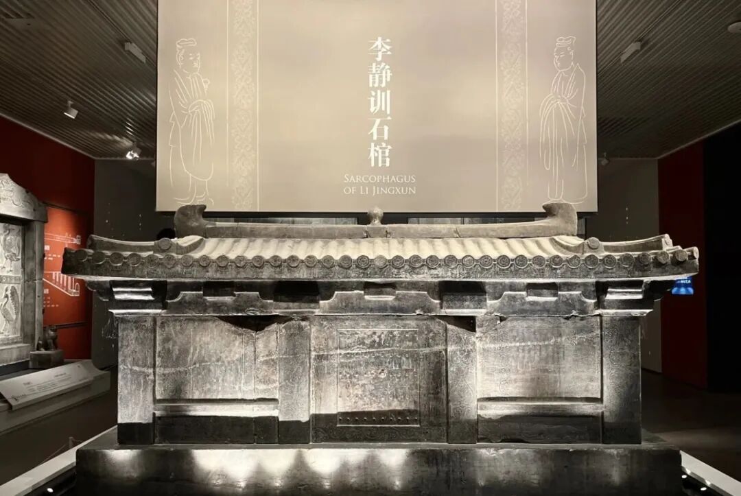 石棺整体为仿歇山式建筑,九脊庑殿顶,宛如一座三开间、带歇山顶的殿堂。四根立柱顶部刻有人字拱,再现了隋唐木构大殿的结构特征。棺门正面两侧,各线刻一位站立的侍女;石棺一侧则雕着一对相向而立的男侍卫,呈现出守护的姿态。门框、窗框、柱、额、槛、方柱等处,阴刻有卷草、莲花、宝瓶、青龙、朱雀等纹样,线条流畅灵动,尽显隋代雕塑艺术的高超成就。