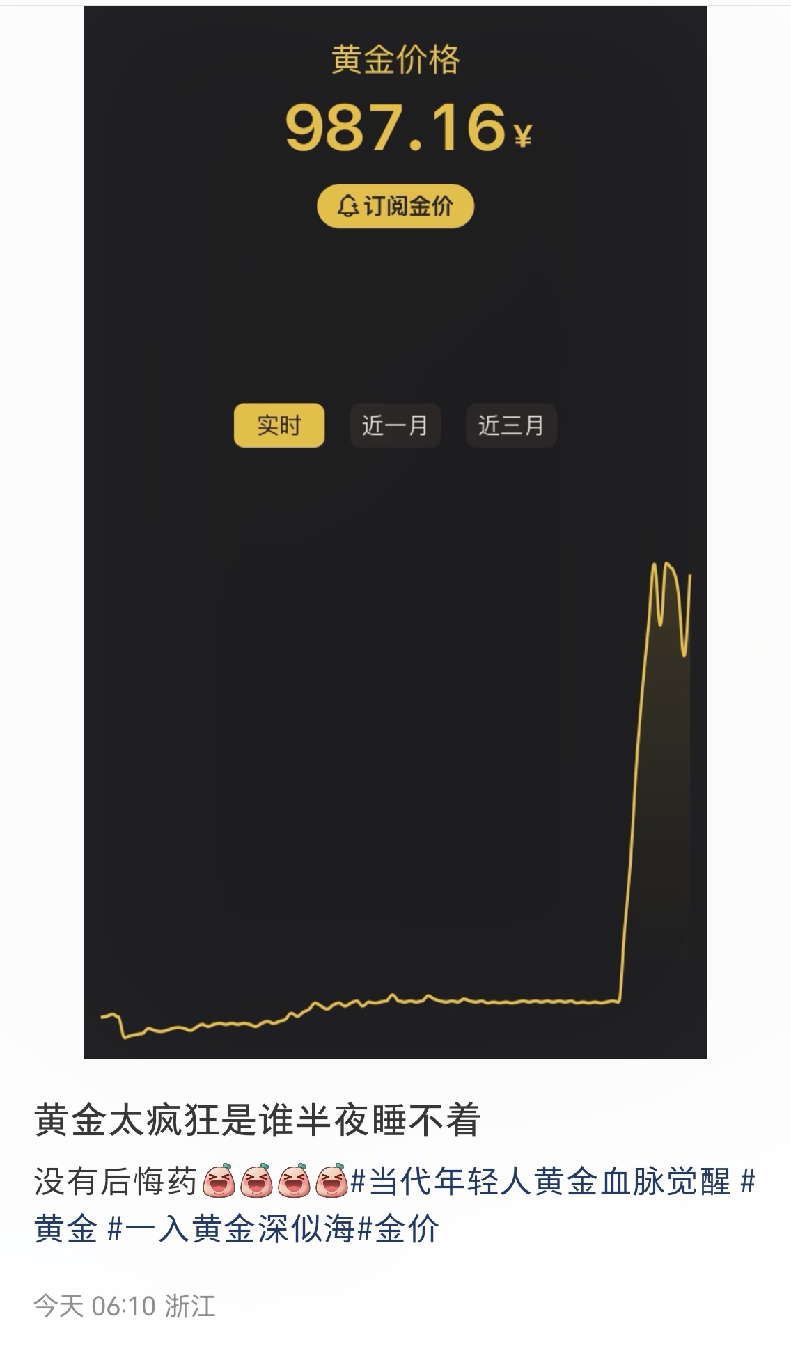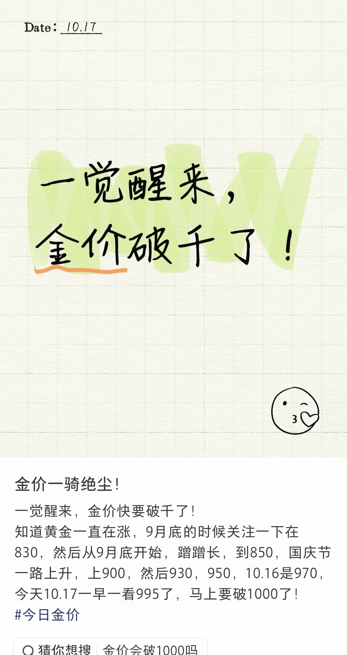 “盯着手机屏幕看了一宿,凌晨5、6点那会儿,看着价格跳到990元,根本睡不着!”10月17日早上8点,成都市民刘女士接受封面新闻记者采访表示,从没想过黄金涨得这么快,克价直逼千元大关,金价走势图完全就是她的“心电图”,最近天天像“着了魔”,昨晚熬完整夜后,今早连心脏都隐隐作痛。