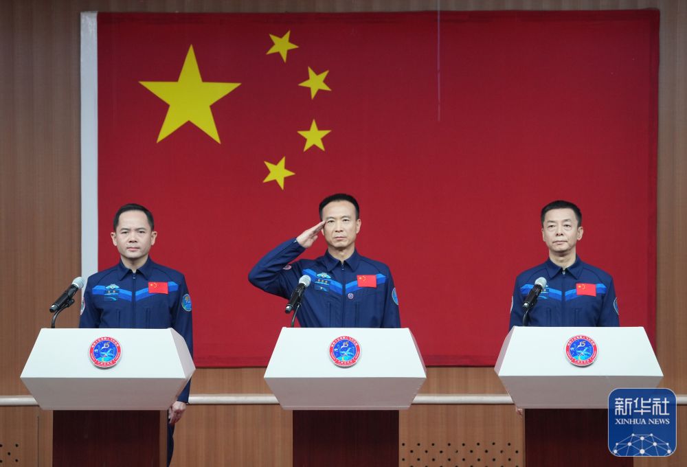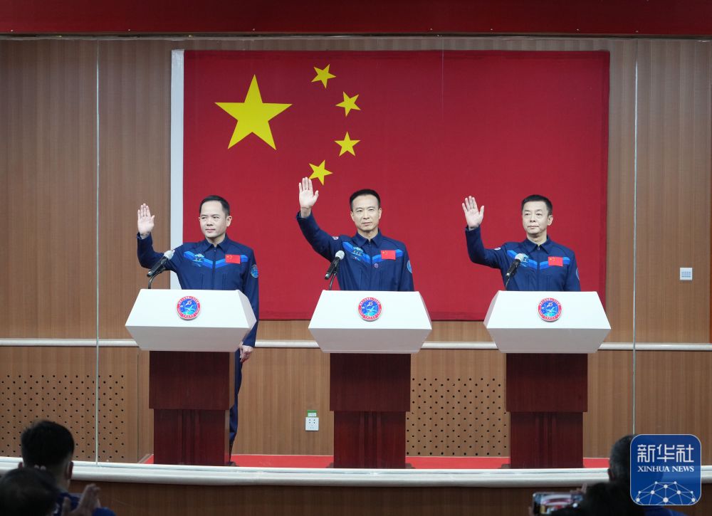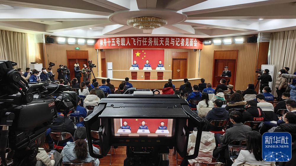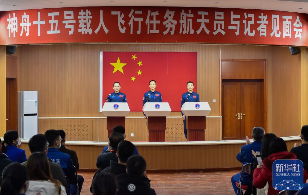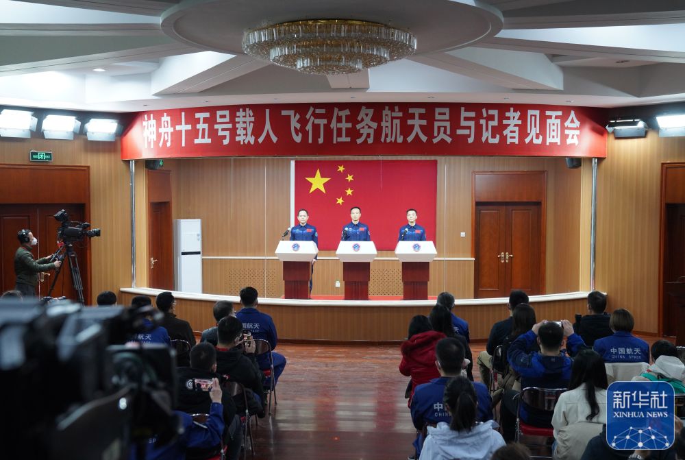 11月28日,执行神舟十五号载人飞行任务的航天员乘组费俊龙、邓清明、张陆在酒泉卫星发射中心问天阁与中外媒体记者集体见面,并回答记者提问。