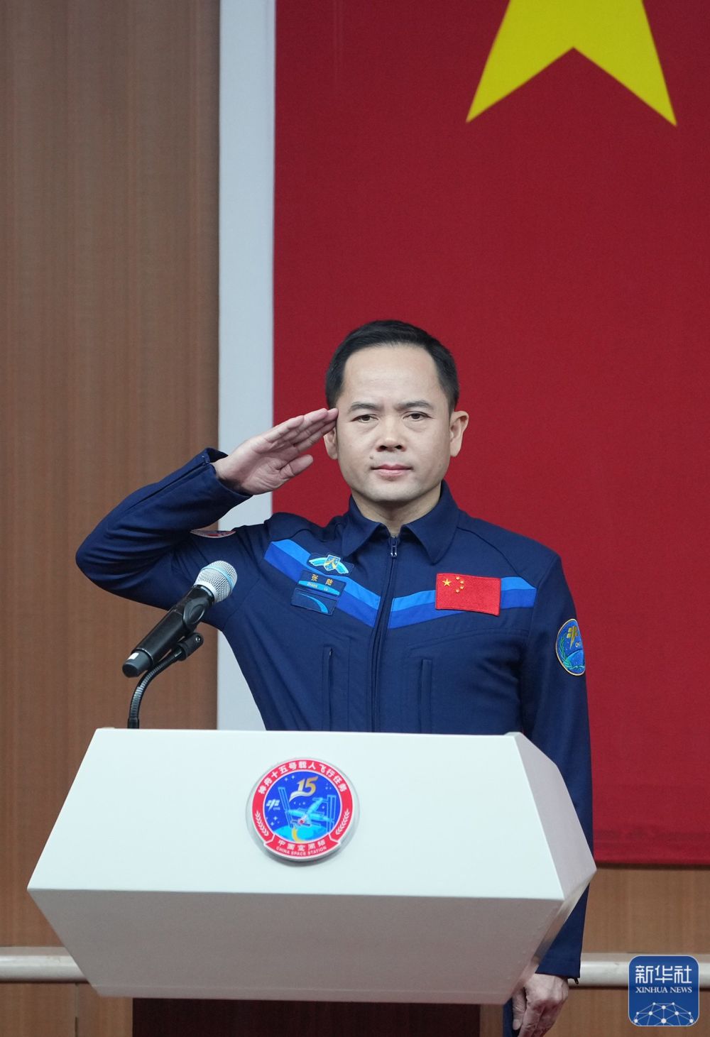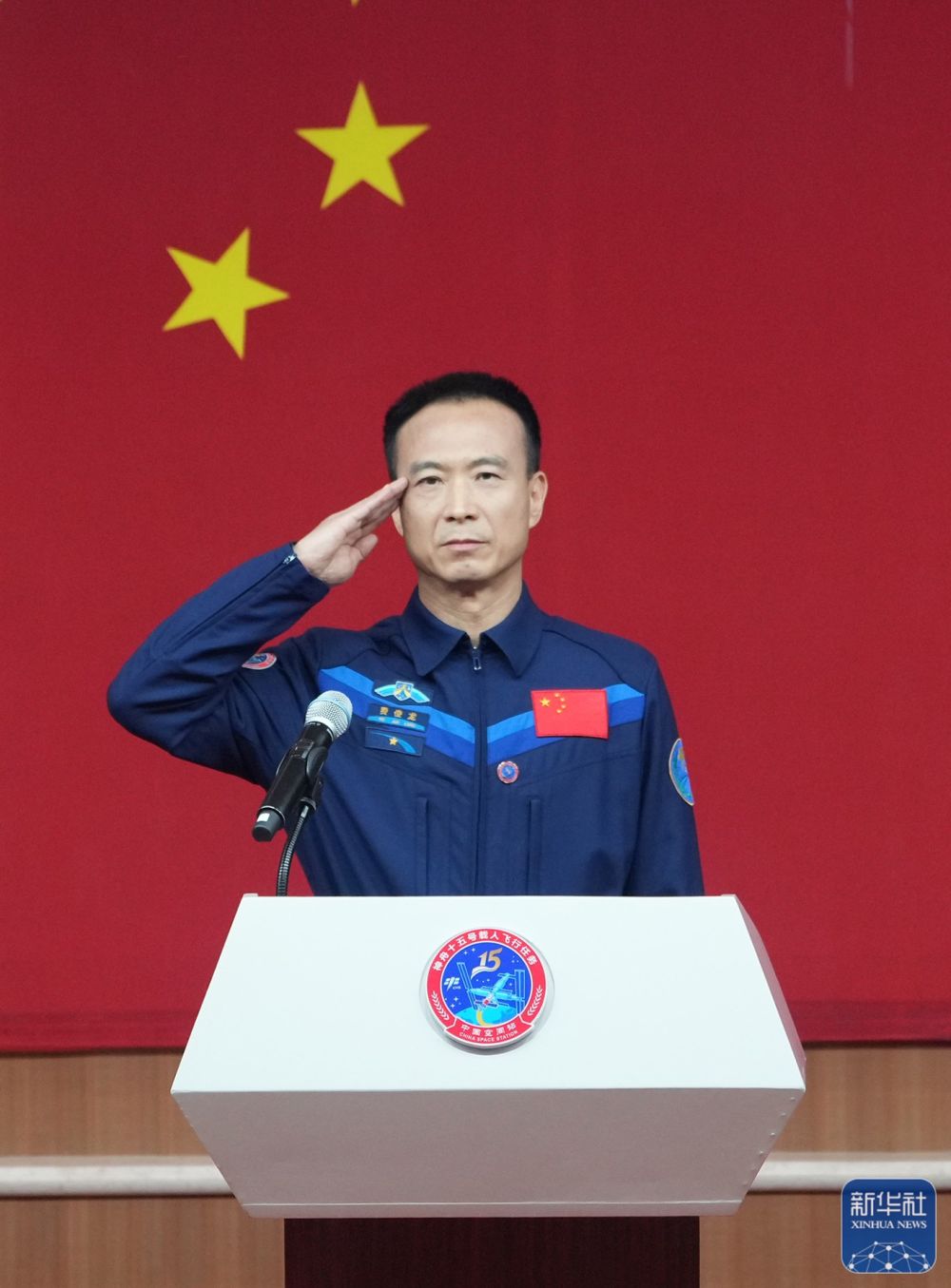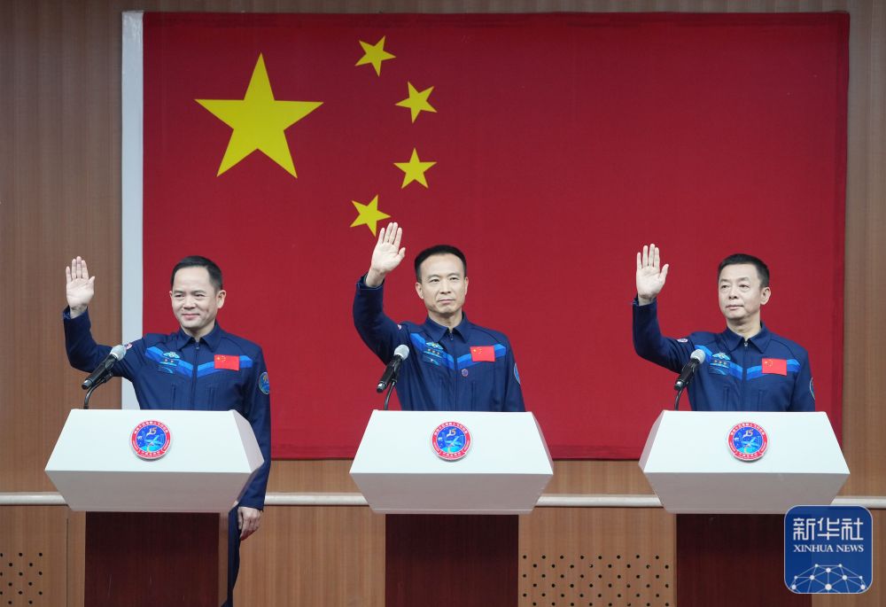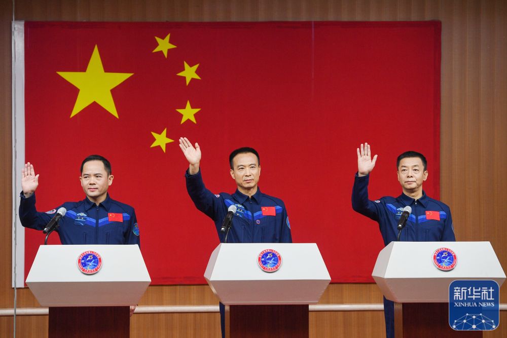11月28日,执行神舟十五号载人飞行任务的航天员乘组费俊龙、邓清明、张陆在酒泉卫星发射中心问天阁与中外媒体记者集体见面,并回答记者提问。