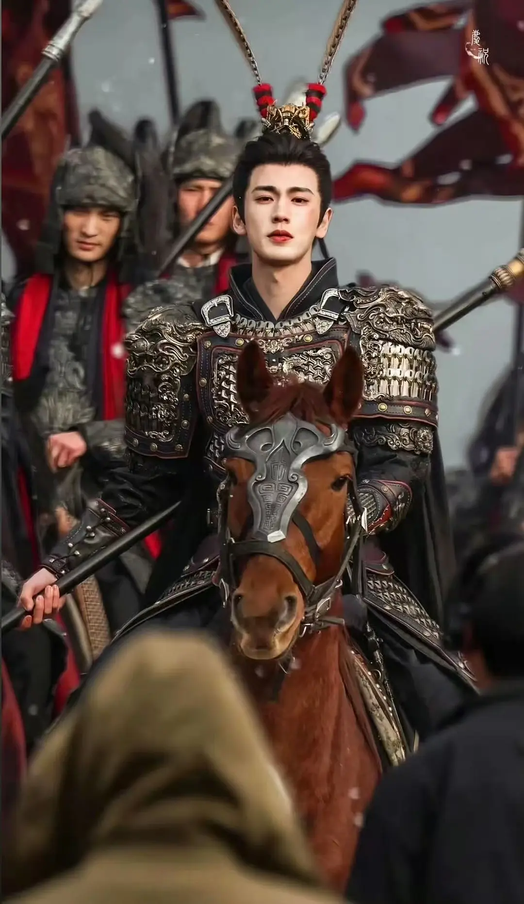 张凌赫饰演的武安侯谢征头戴雉尾翎。《逐玉》剧照