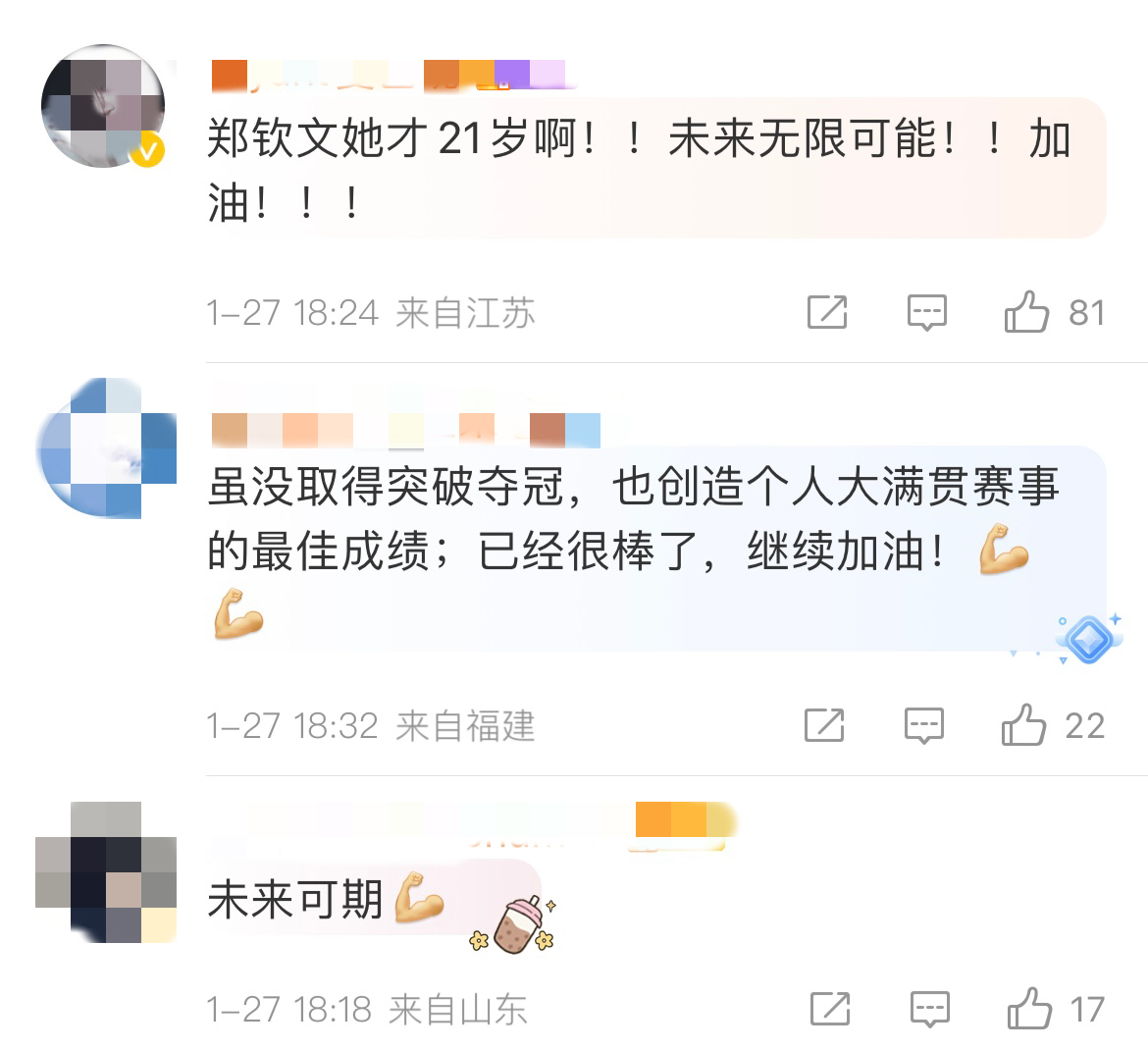 郑钦文在本届澳网一路过关斩将,首次跻身大满贯赛事女单决赛,是网友口中本届的“黑马”。面对赛季卫冕冠军萨巴伦卡,郑钦文依旧发挥出色,虽然无奈3:6、2:6不敌对手,但是网友们也纷纷表示,“21岁的郑钦文真的很棒了!”