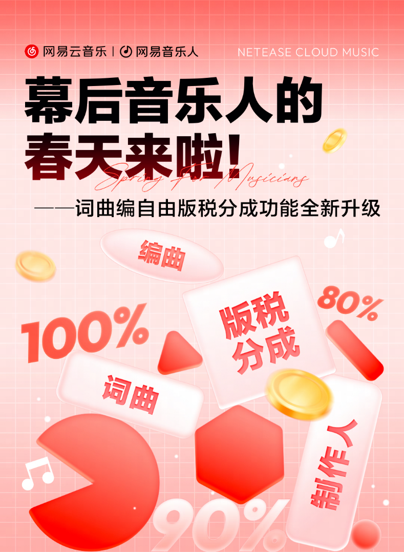 1月30日,网易云音乐宣布面向音乐行业推出升级举措,针对幕后音乐人群体发布“编曲人自由版税”功能,将编曲人群体正式纳入歌曲发布后版税收益分成中,通过真金白银的收益增长,让每一份创作都能收获应有的回报。